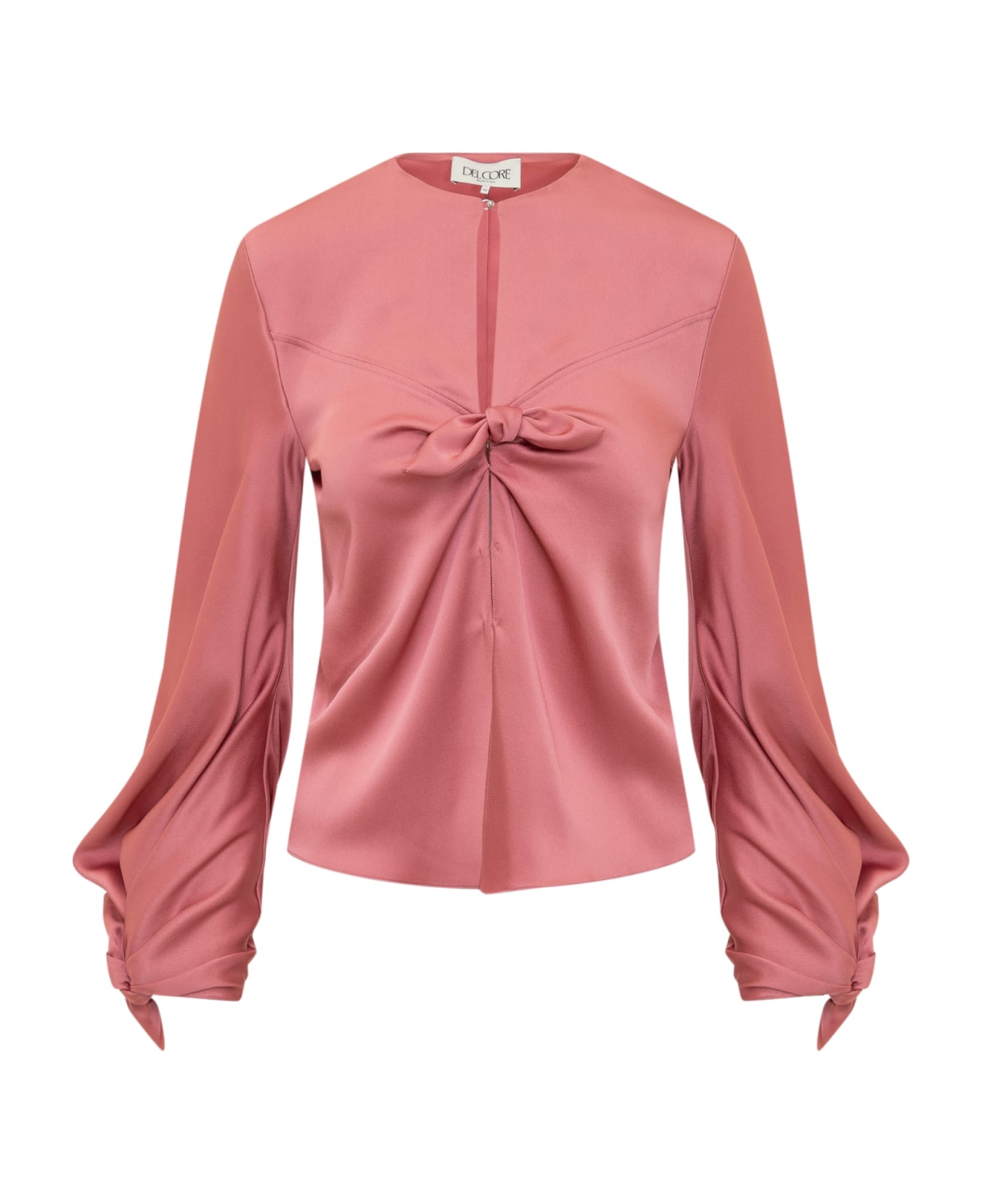 Pink blouse with long sleeves. Bow detail on the front. Front closure with hooks. Bow at the wrists.