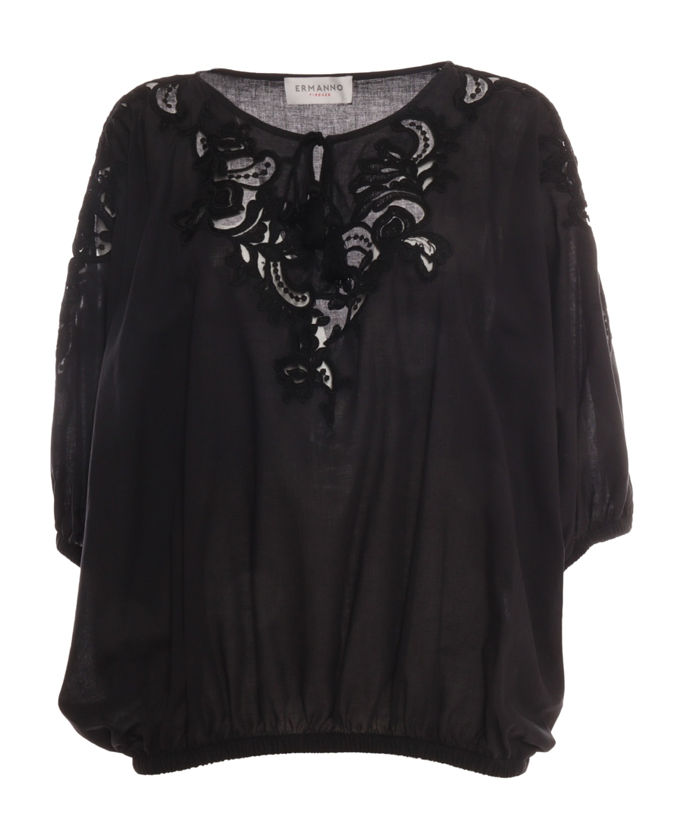 Cotton blouse, lace details, tassels on the neckline, elasticated edges