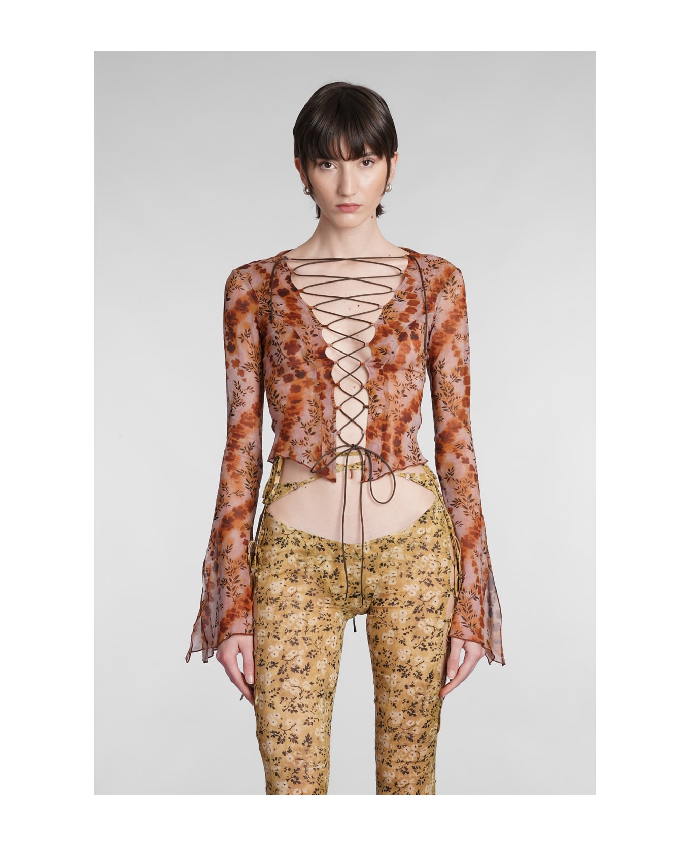 Blouse in rose-pink silk, lace up, floral print, long sleeves, Made in Uk, 92% silk, 8% elastan, Model is 180 cm and wears a size 8