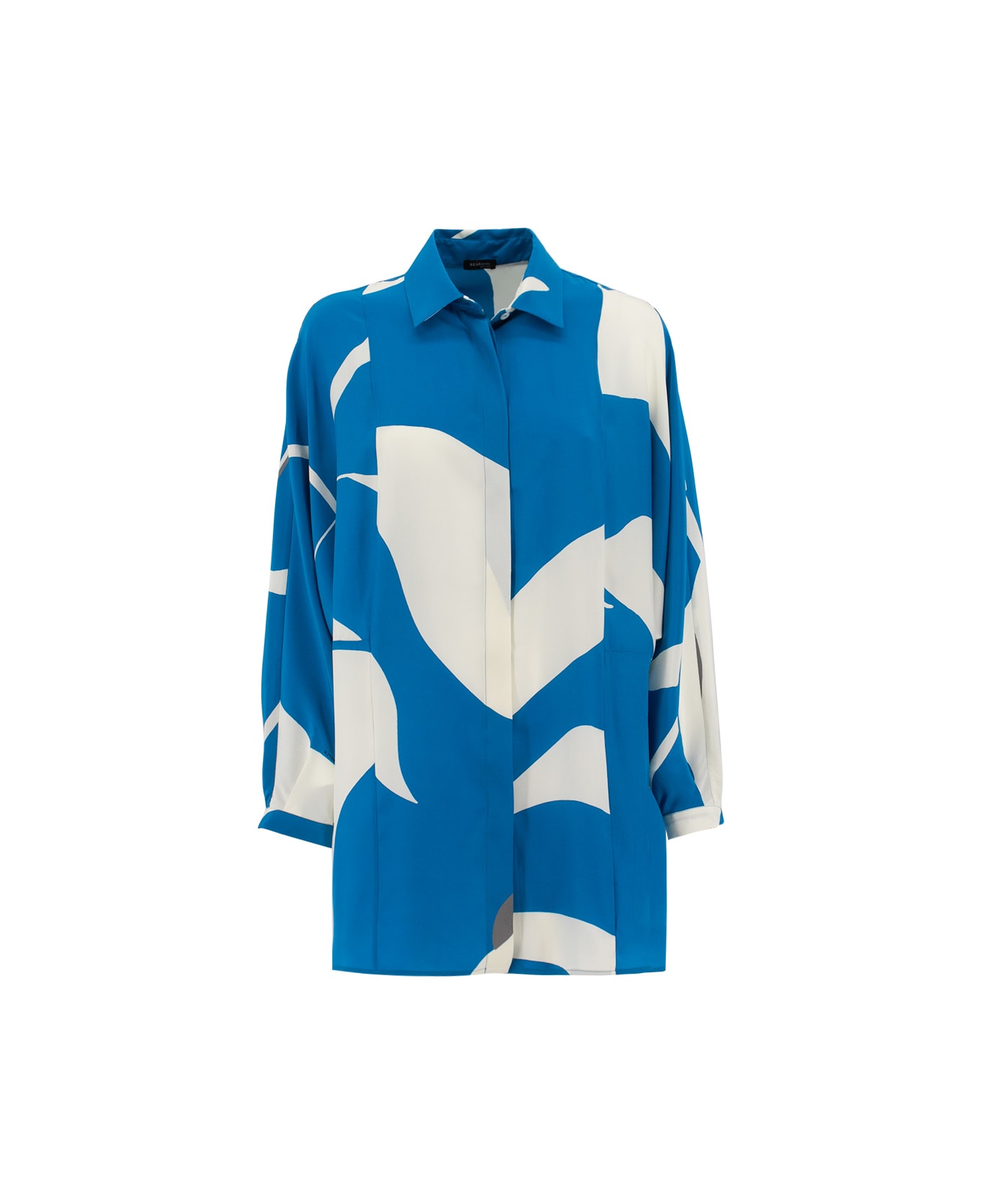 A long blouse made of precious silk with a printed pattern, the design of the garment is characterised by a masculine cut that combines with a feminine volume. The button fastening concealed by a strip of fabric is a detail that gives the blouse an elegant and sophisticated regular fit. Composition: 100% SE