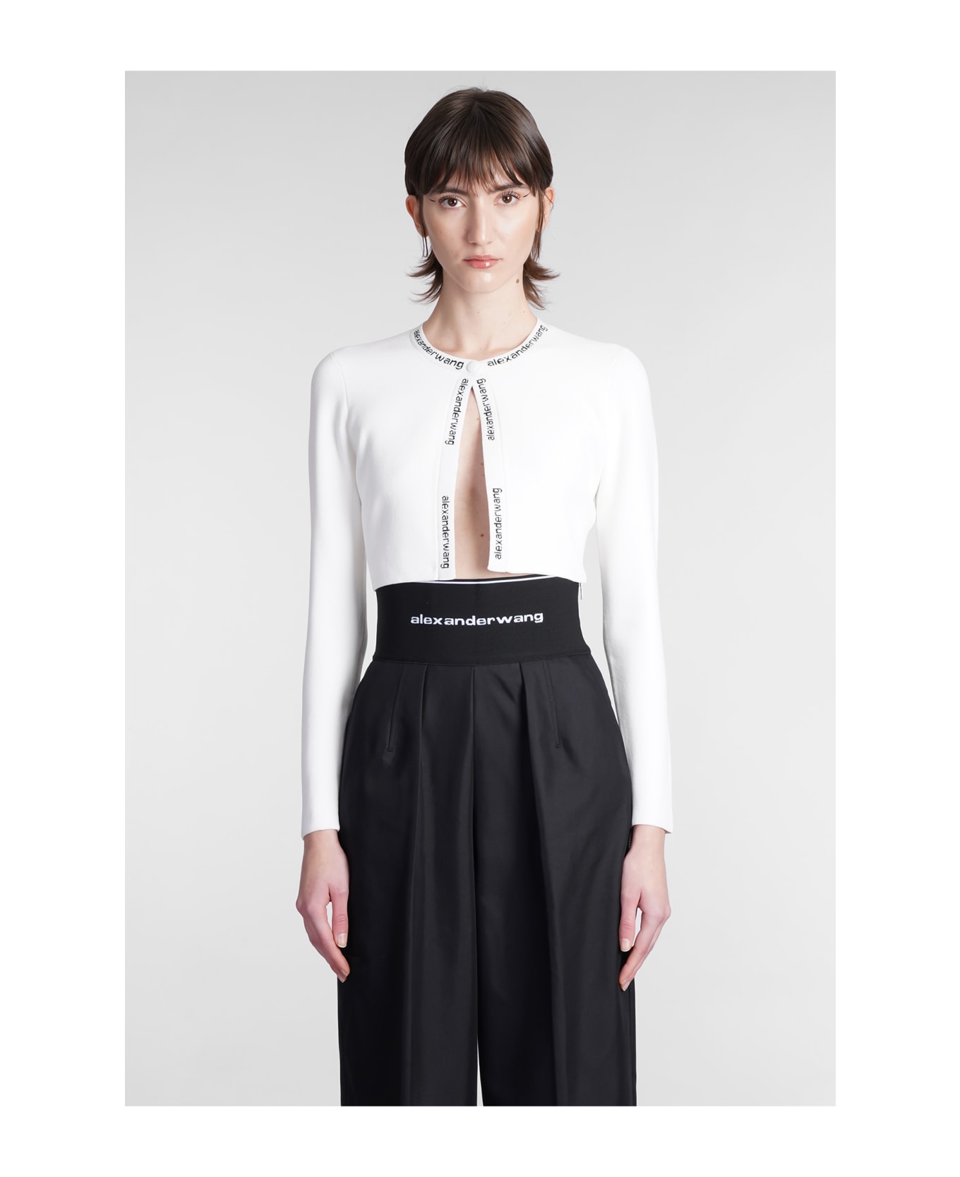 Cardigan in white viscose, round neck, long sleeves, logo trim, 66% viscose, 20% Nylon, 12% polyester, 2% elastan, Made in China, Model is 180 cm and wear a size S