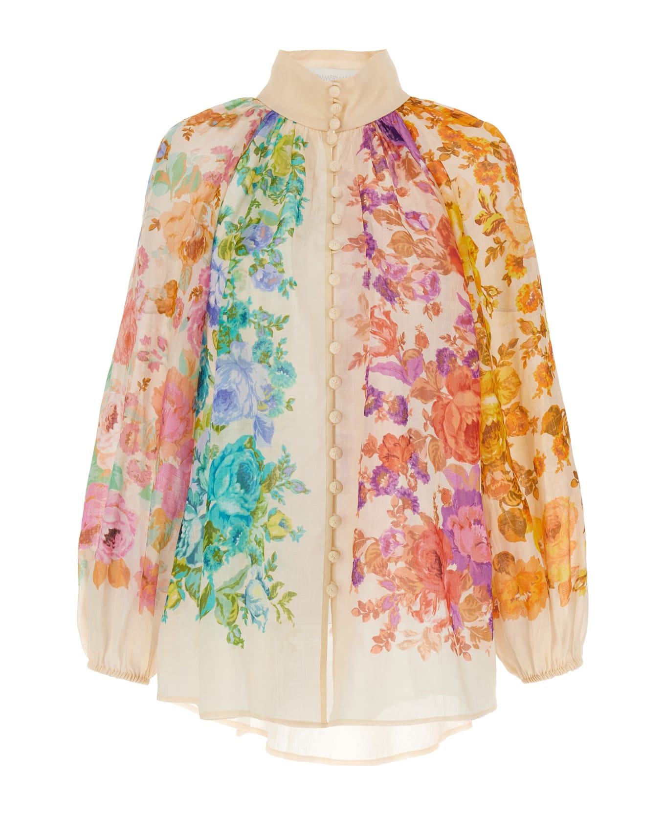 All-over floral print blouse in ramie with covered button closure, and balloon sleeves with elastic.