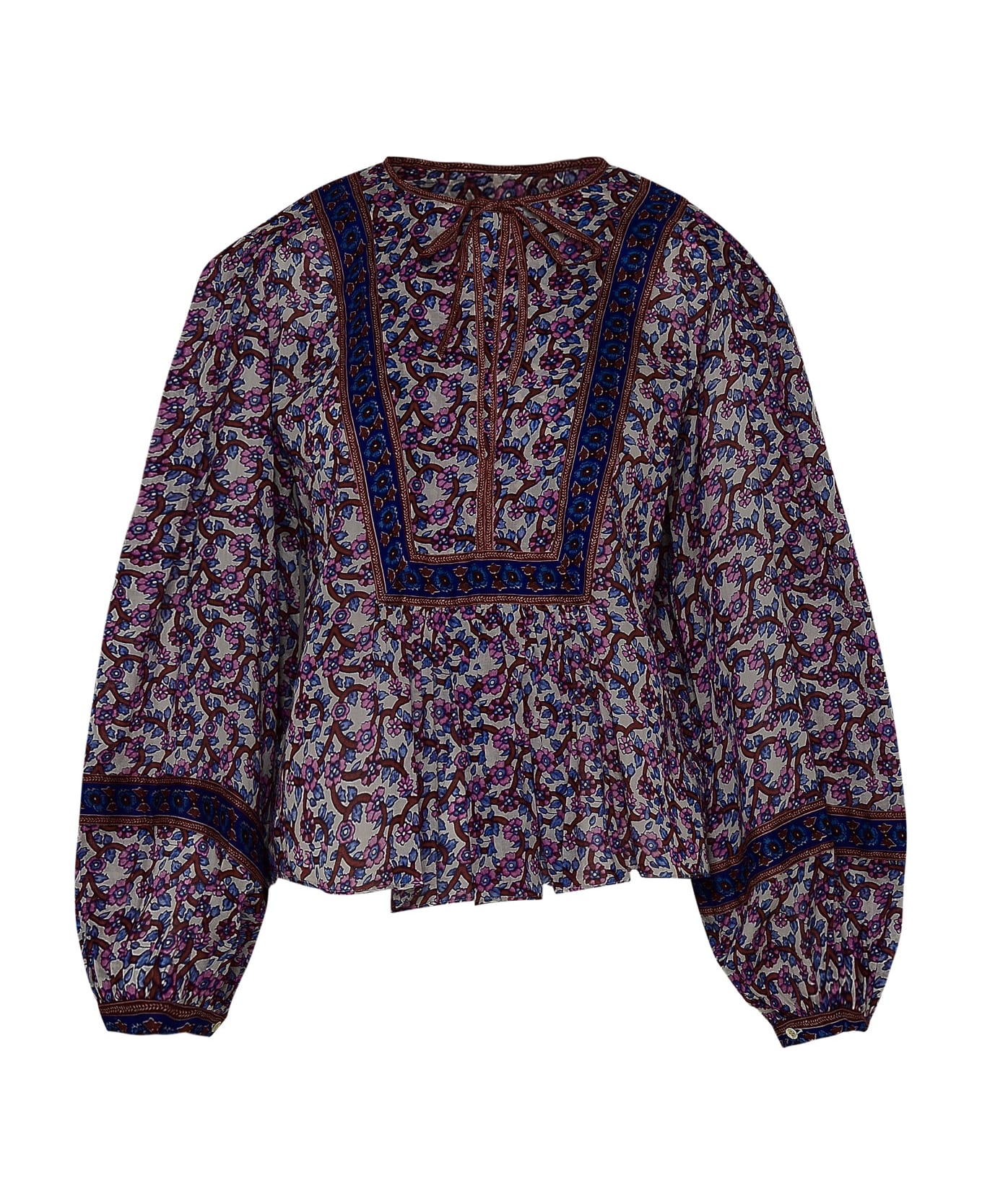 Crew neck, lace-up front and hook-and-eye closure, puff sleeves, button sleeve bottoms, all over floral print