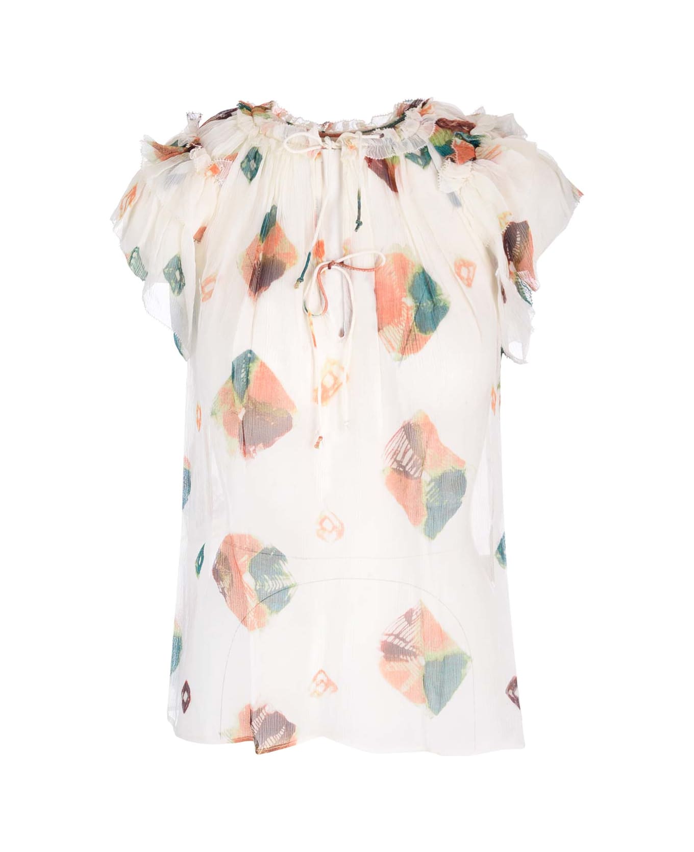 "Marilyn" silk crepe top from Ulla Johnson with cap sleeves, gathered design and "Aurora" print.