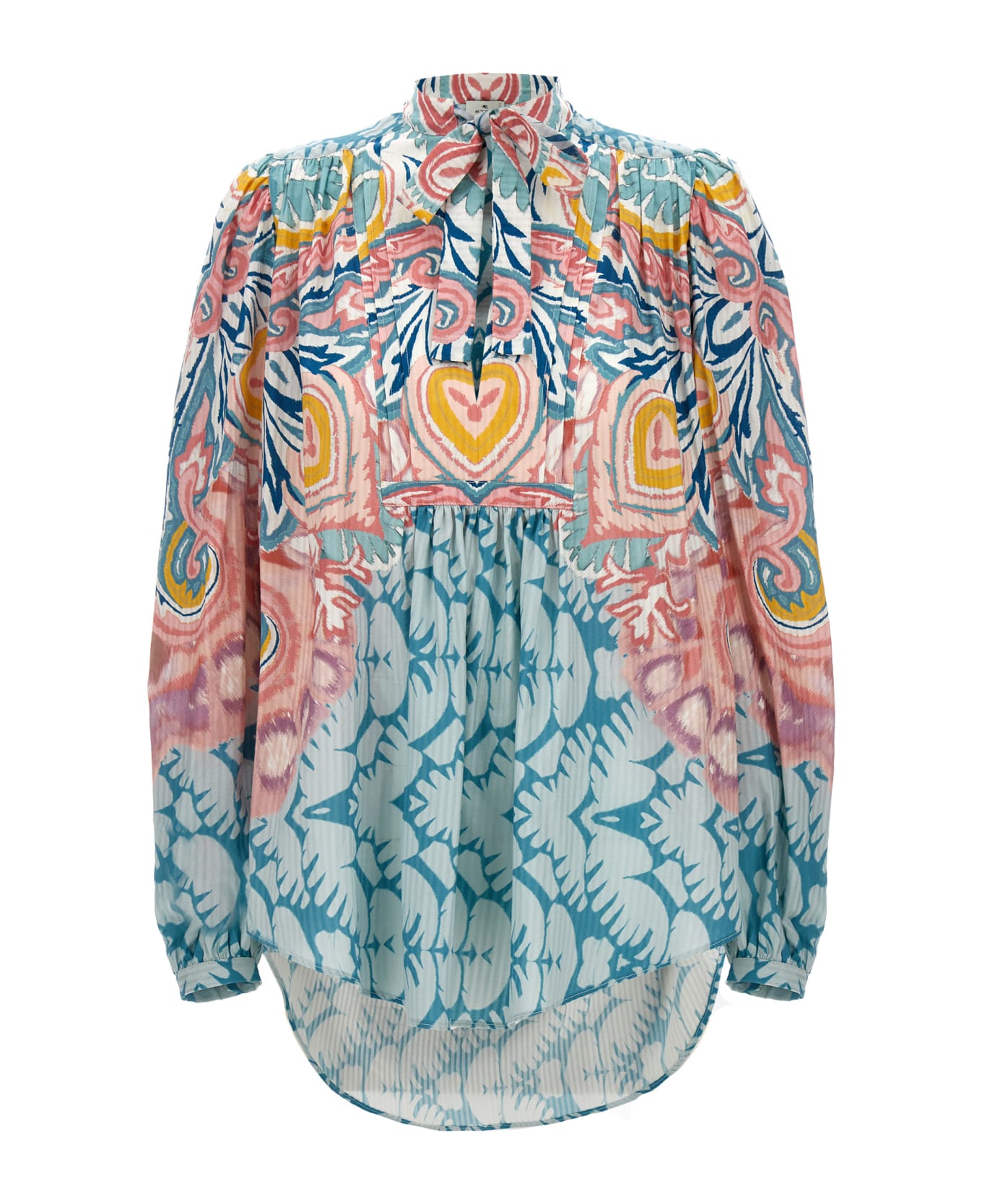 Cotton and silk blouse with multicolor 'Paisley' print, plisé front motifs, 3/4 puff sleeves with cuffs and a mandarin collar with tape. Composition: 82% cotton 18% silk