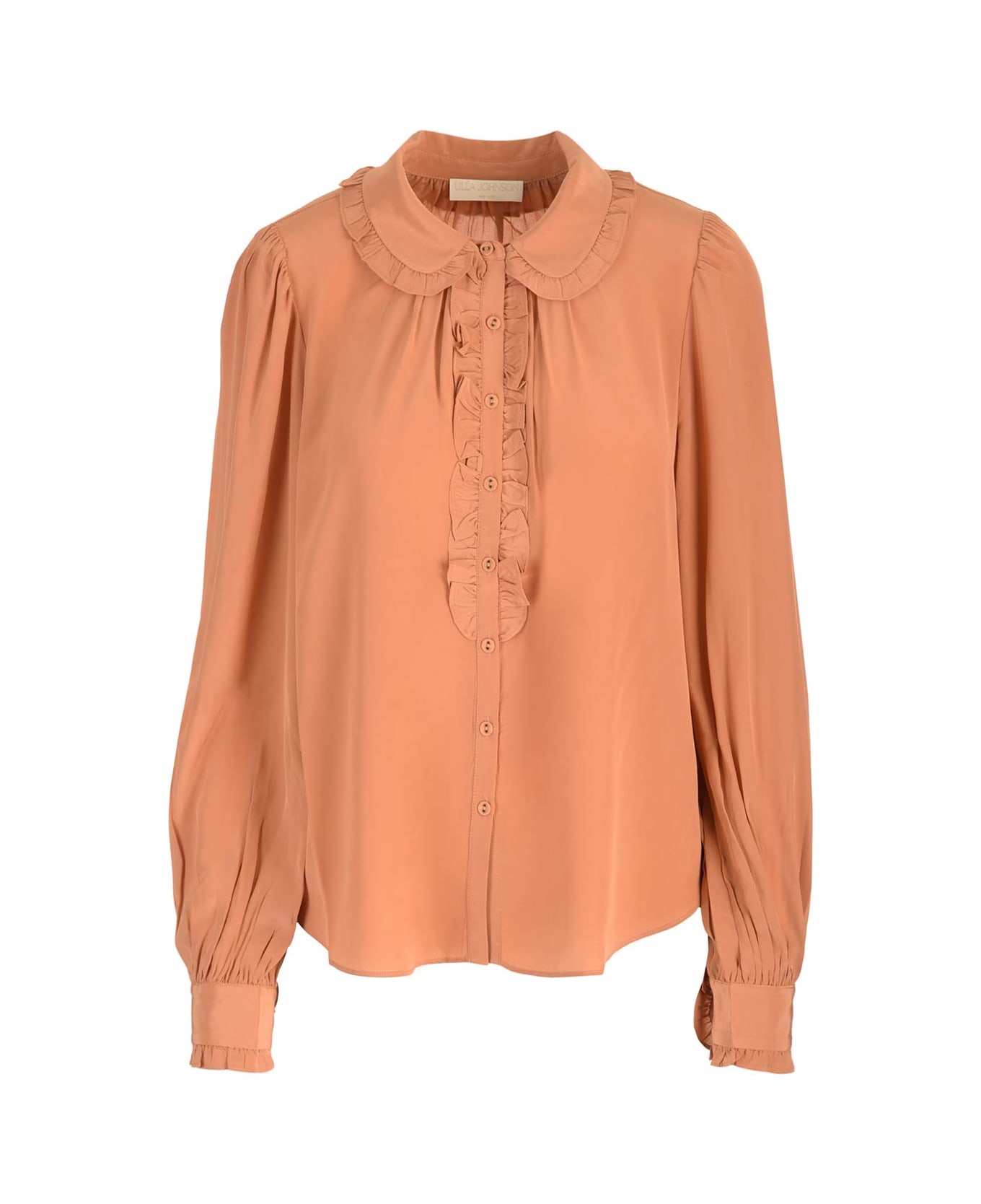 "Philipa" blouse in pastel orange silk crepe from Ulla Johnson, with rounded neck, front buttons, applied ruffles, standard fit.
