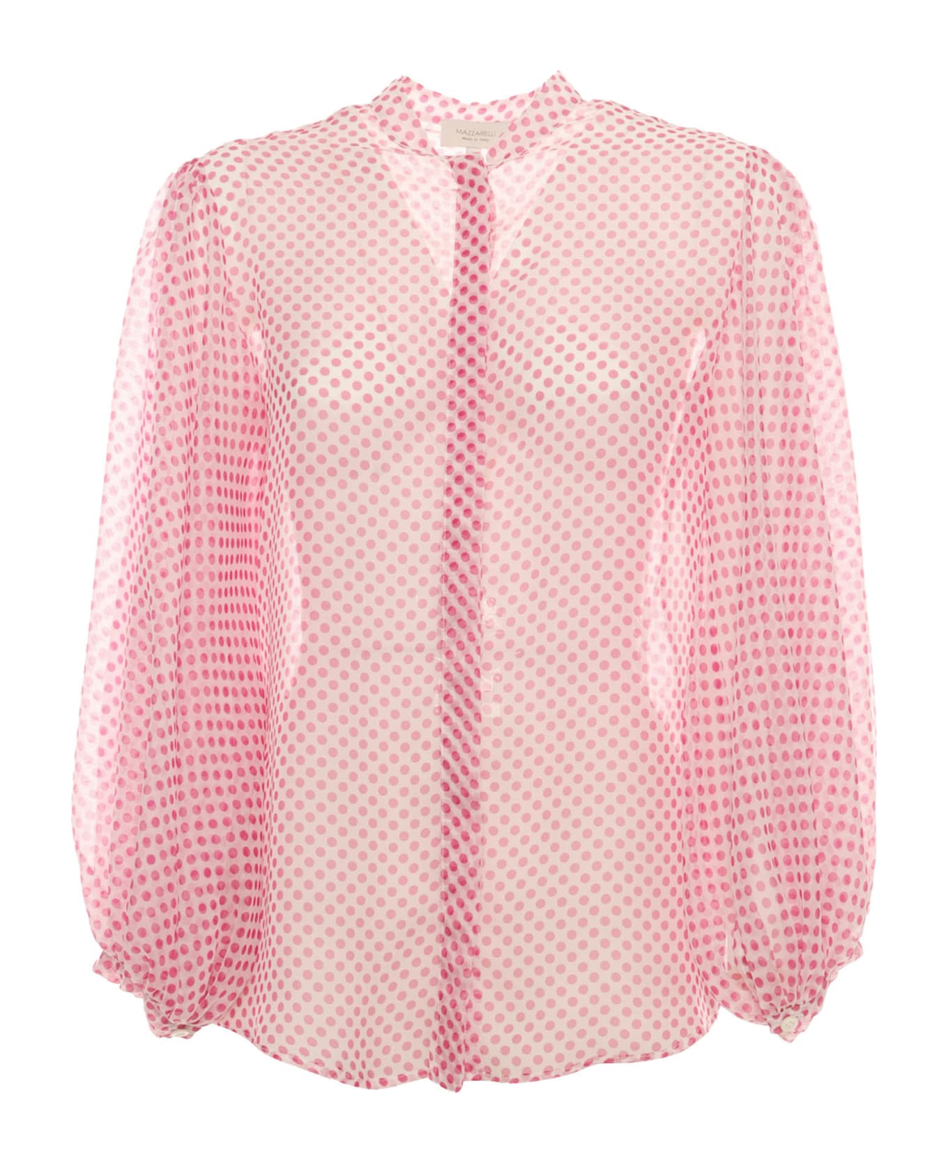 Chiffon shirt, all over polka dot pattern, mandarin collar, hidden buttoning, wide sleeves with elastic cuffs