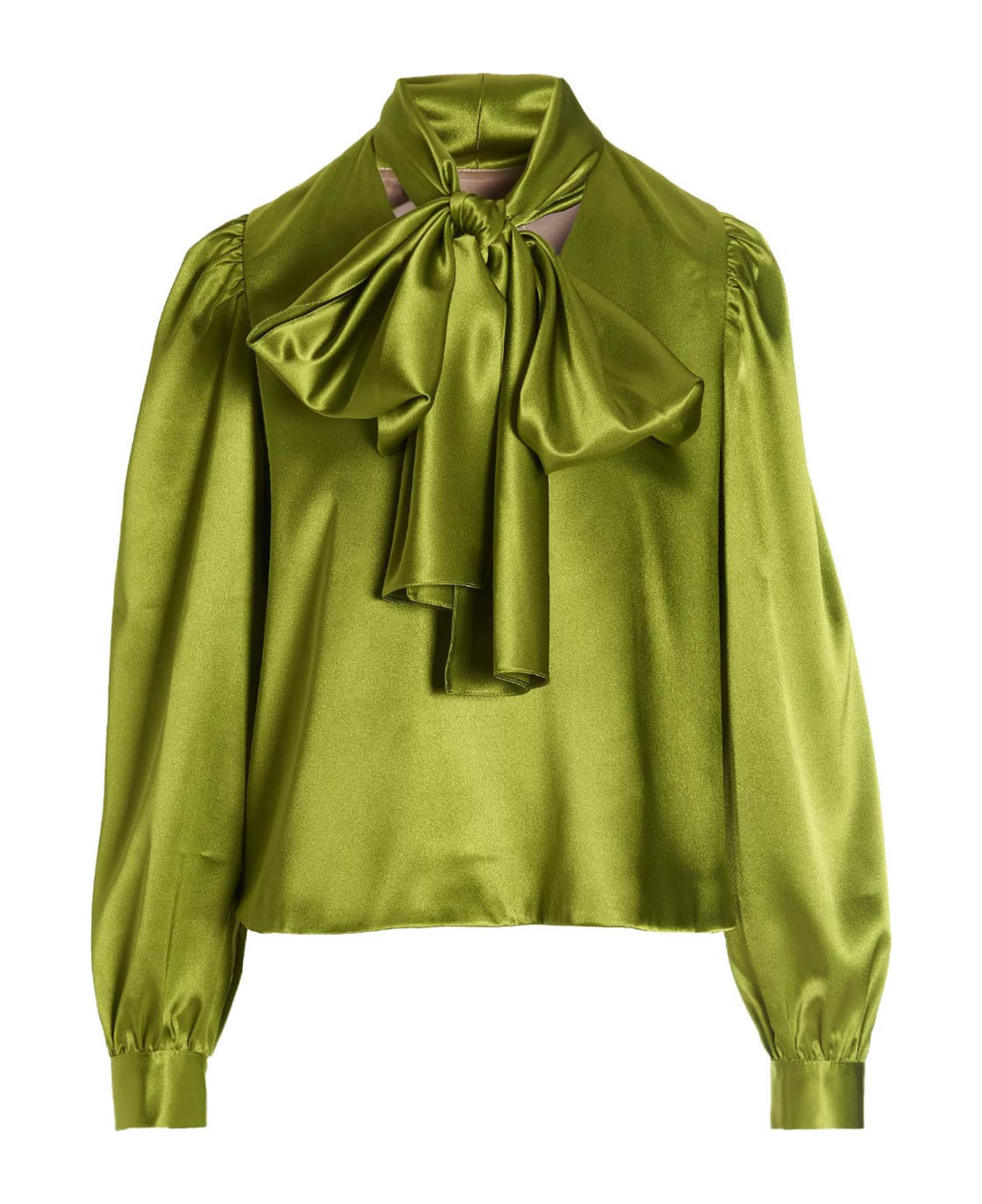 Viscose satin blouse with pussy bow, nd long cuffed sleeves.
