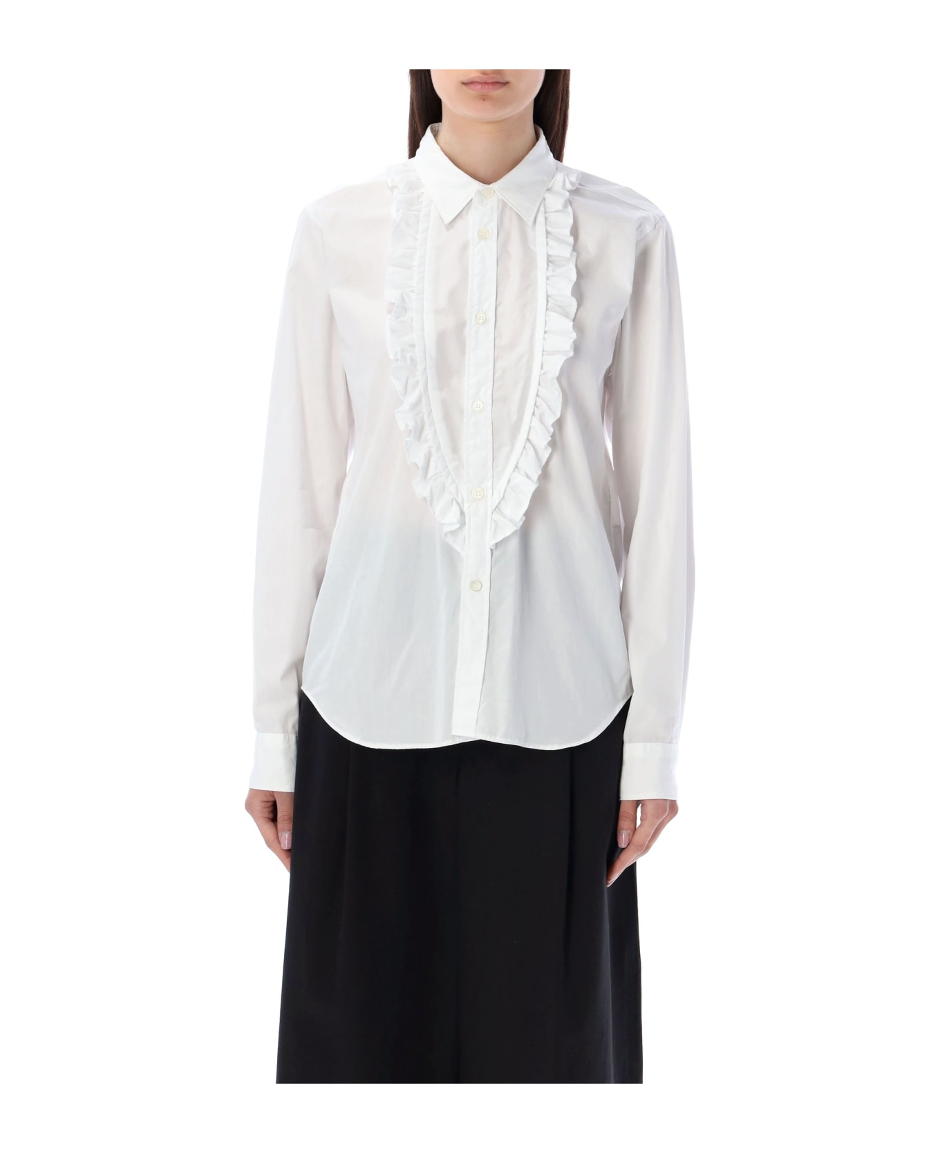 Cotton Ruffled Shirt By Black Comme Des Garçons. Featuring: Pointed Collar Front Buttons Fastening Front Bub With Ruffled Edges Long Sleeves Buttoned Cuffs Curved Hem The Model Is 1,72 M Tall And She's Wearing Size S