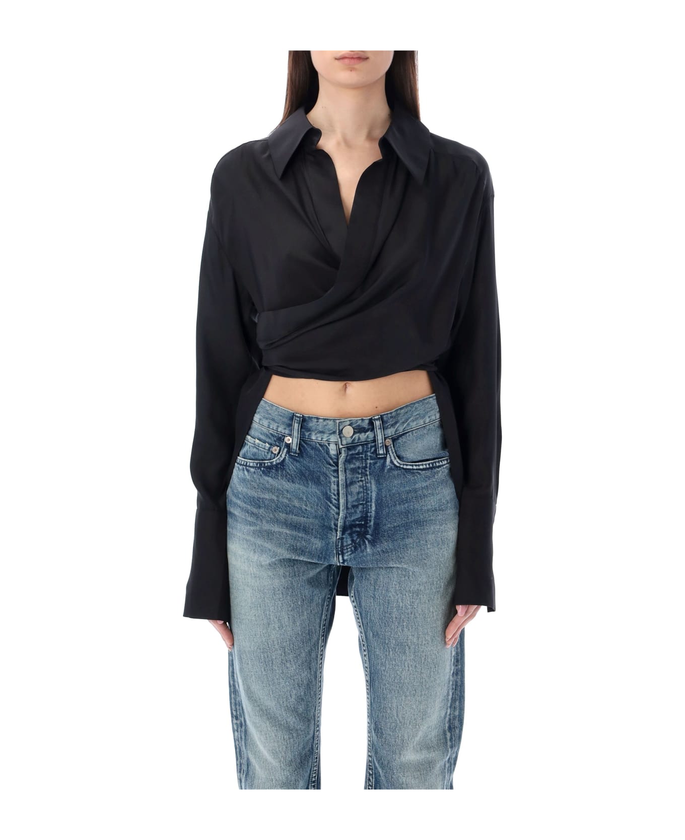 Sabinas Silk Blouse By Gauge81. Featuring: Point Collar V-neck Draped Design Wrap Design With Hooks Closure At Back Long Sleeves Wide Buttoned Cuffs Asymmetric Hem Curved Hem At Back Model Is 1,72 M Tall And She Is Wearing Size S