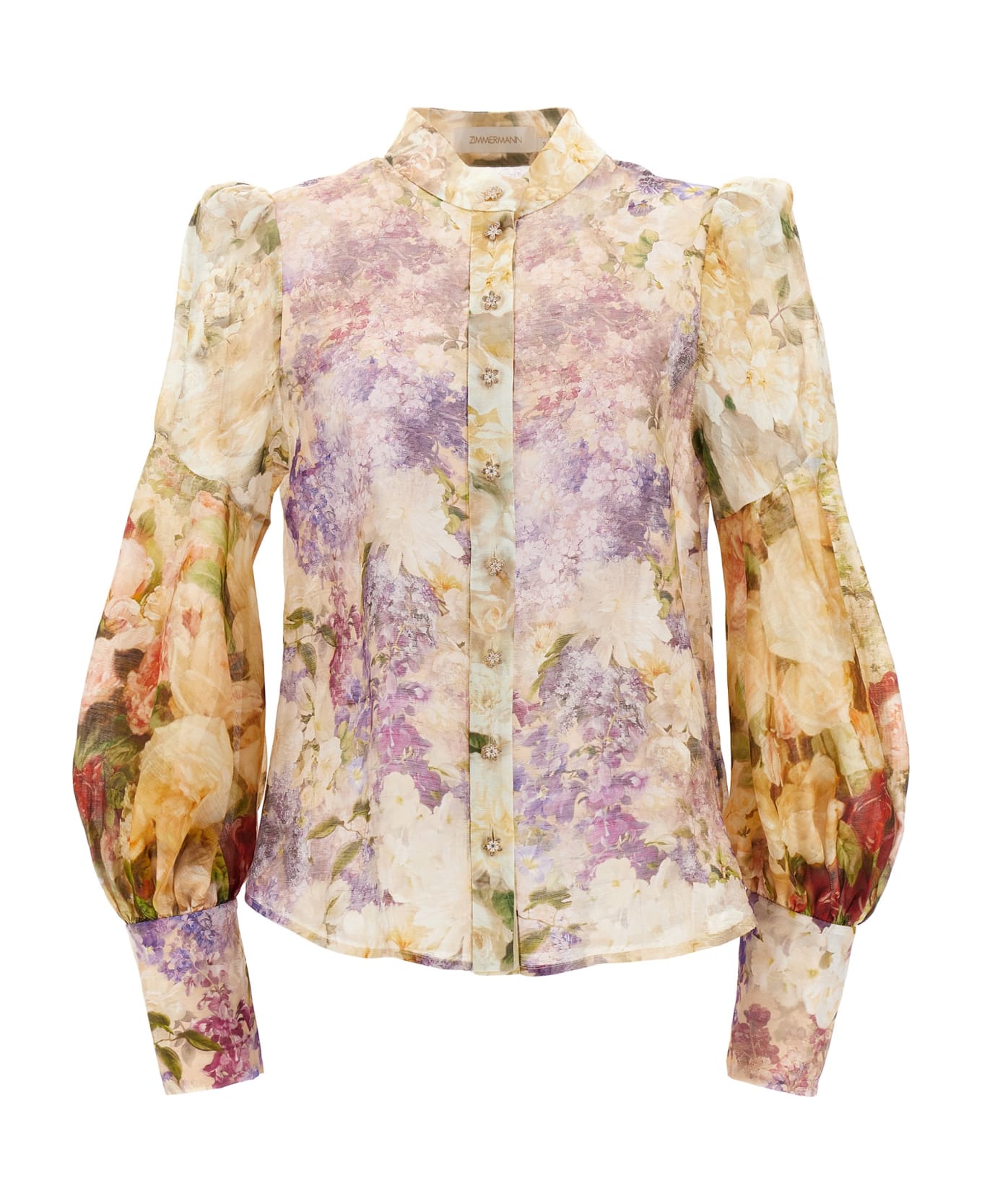 'Sensory Spliced' linen and silk shirt with floral print, jewel button closure, long cuffed sleeves.