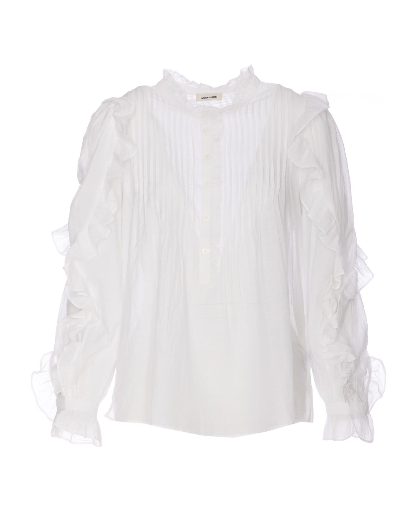 Zadig&Voltaire white shirt with frontal buttons closure, crewneck, laces details, rouches detail on sleeves, button on cuffs Composition: 72% Cotton, 28% Viscose