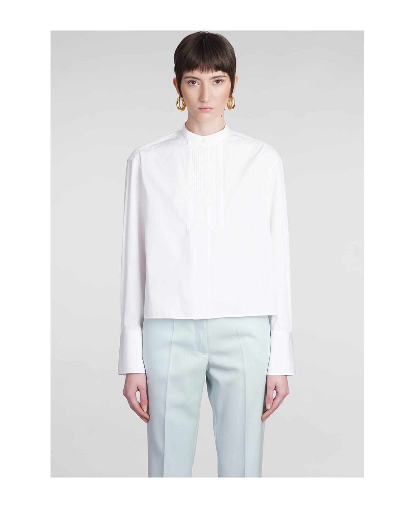 Shirt in white cotton, mao collar, crop cut, long sleeves, frontal buttoning, 100% cotton, Made in Italy, Model is 180 cm and wears 36