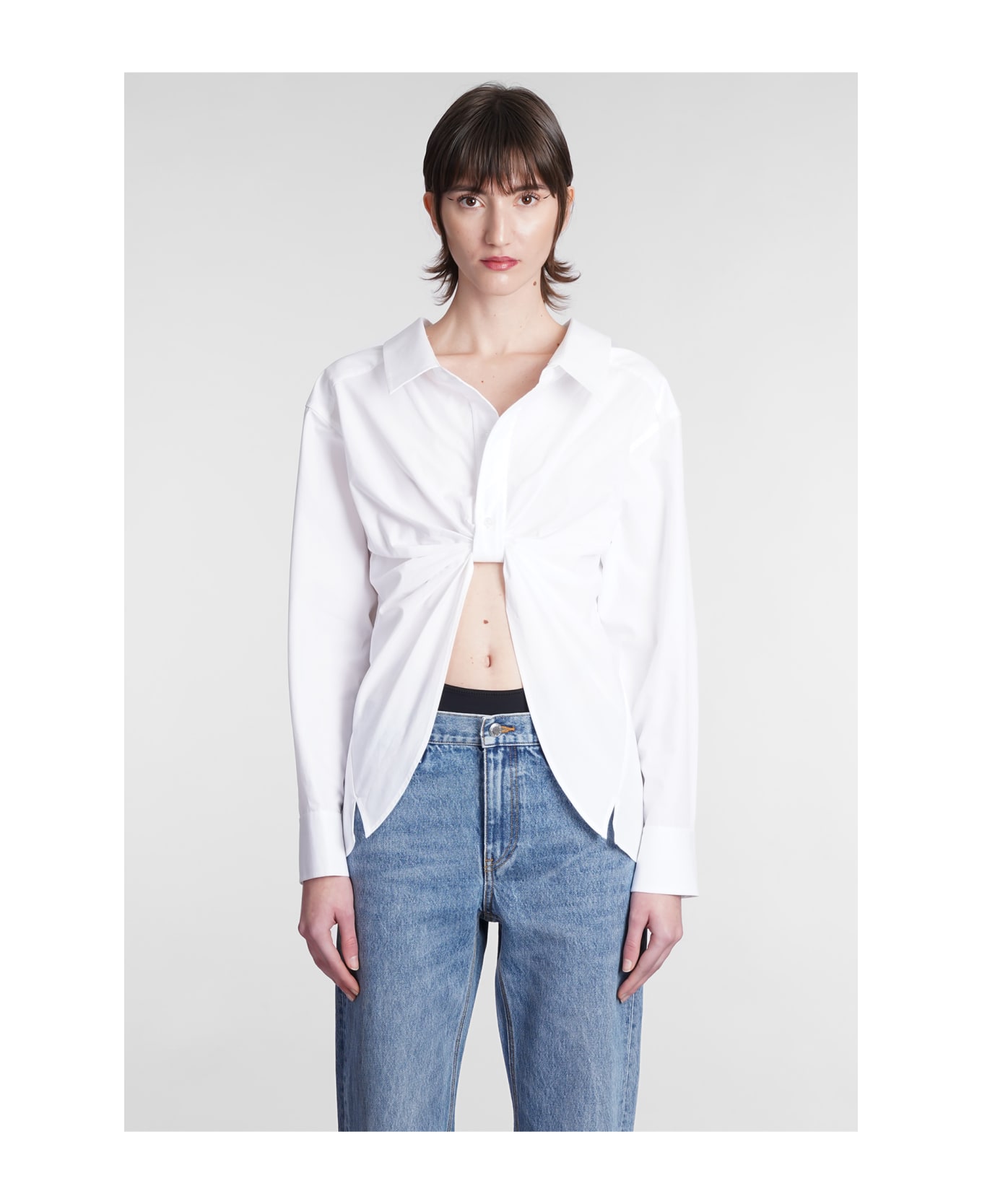 Shirt in white silk, collar, long sleeves, frontal knot, 100% cotton, Made in China, Model is 180 cm and wear a size S