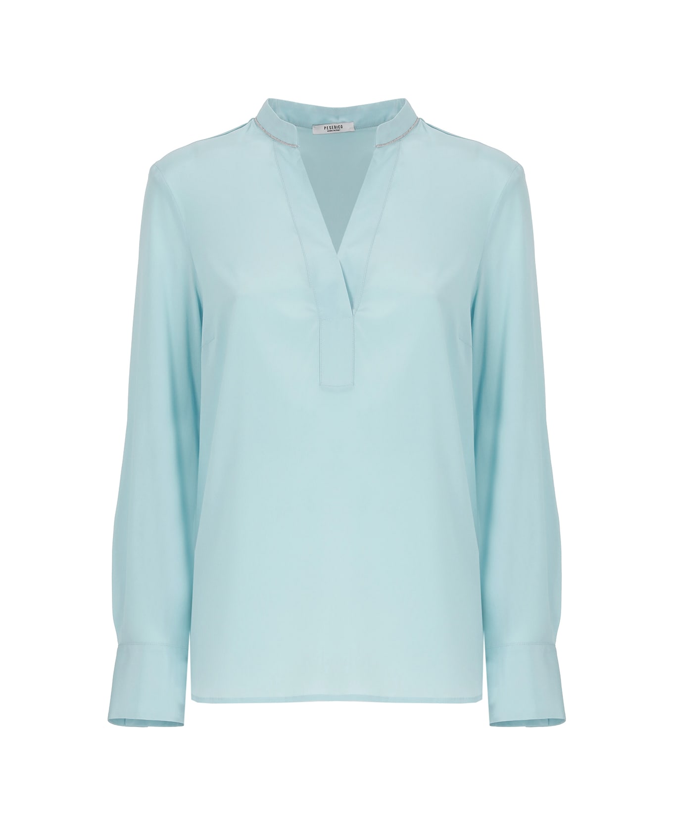 - Sky blue Peserico silk crepé blouse for woman - Korean collar with micro beads at trims - Long sleeves with buttons at cuffs - Rounded hem with side vents Composition: 94% Silk, 6% Elastane