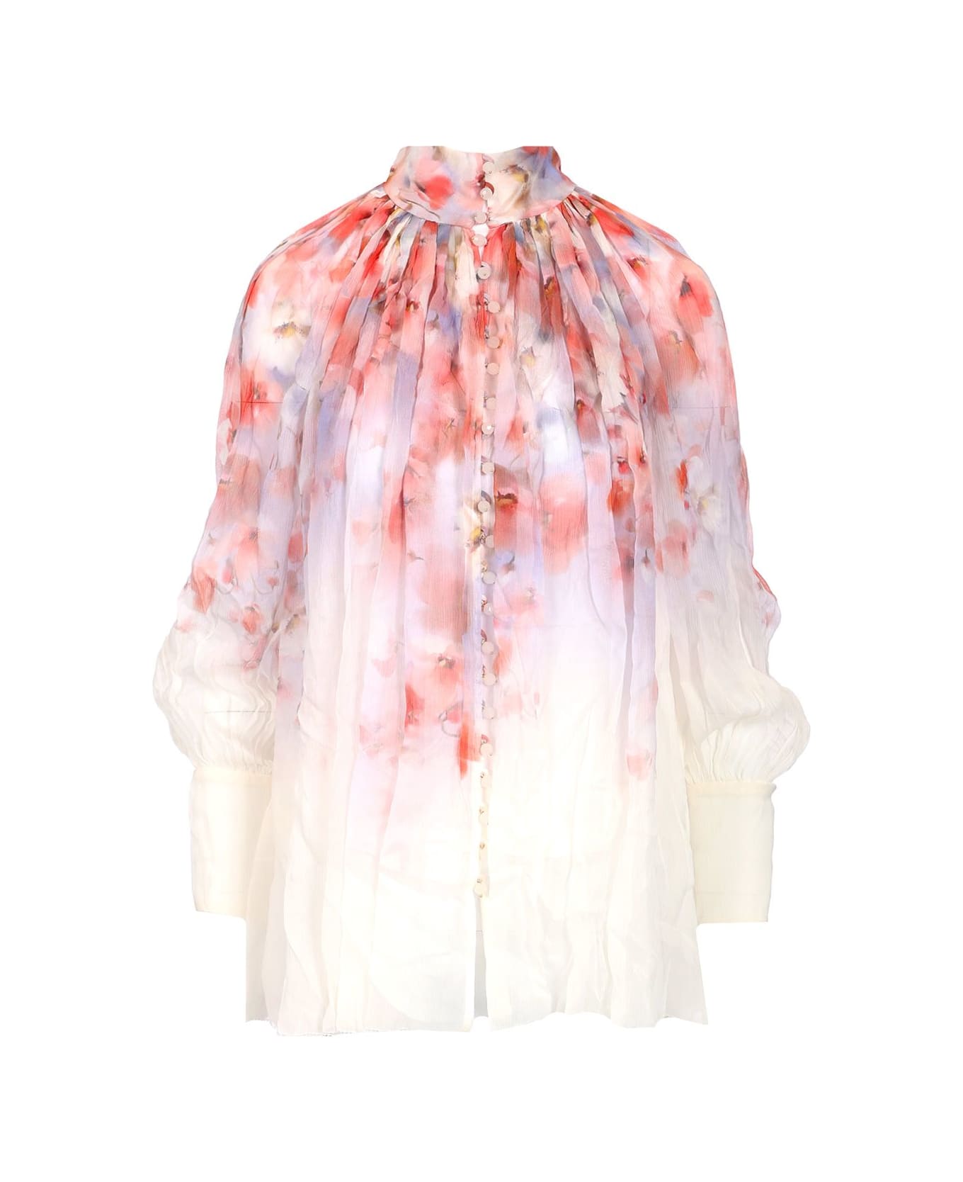 'Smock Crush' blouse by Zimmermann, with a high collar and puffed sleeves with extended cuffs. Front button closure. Separate white top with thin shoulder straps.