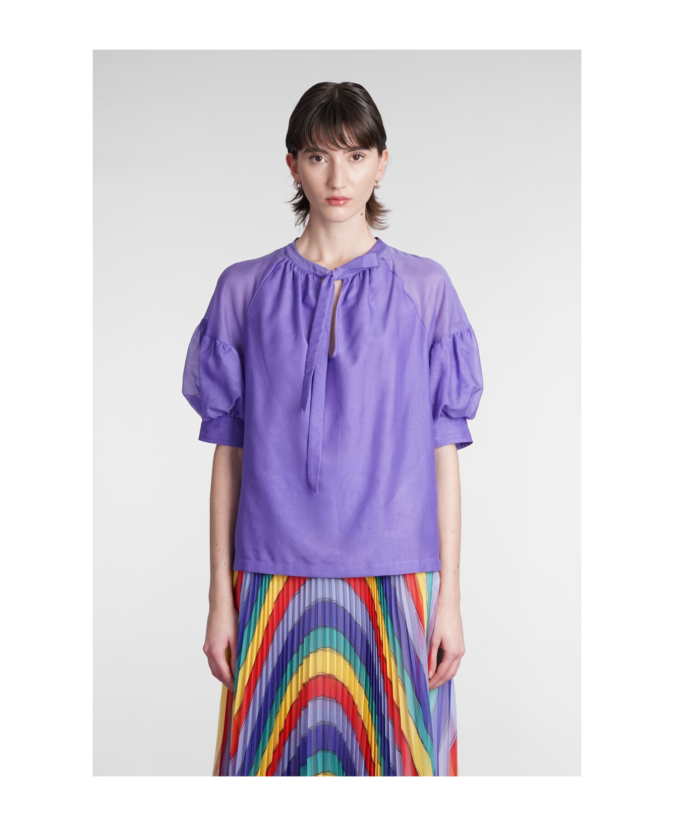 Topwear in Viola cotton, puff sleeves, round neck, tie neck, 70% cotton, 30% silk, Made in Italy, Model is 180 cm and wears 38