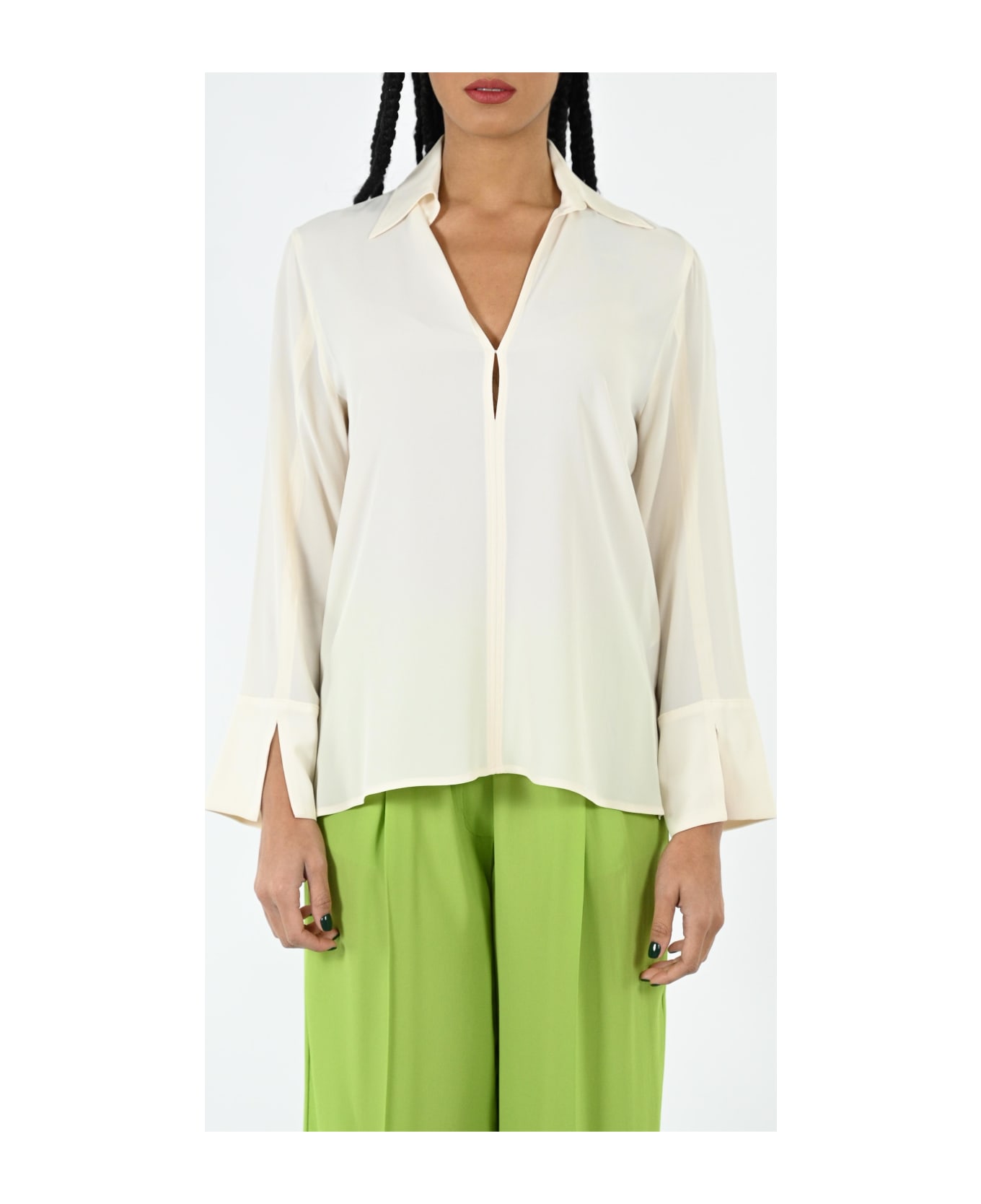 beige, long sleeves, split hems, v-neckline and classic collar. origin: italy