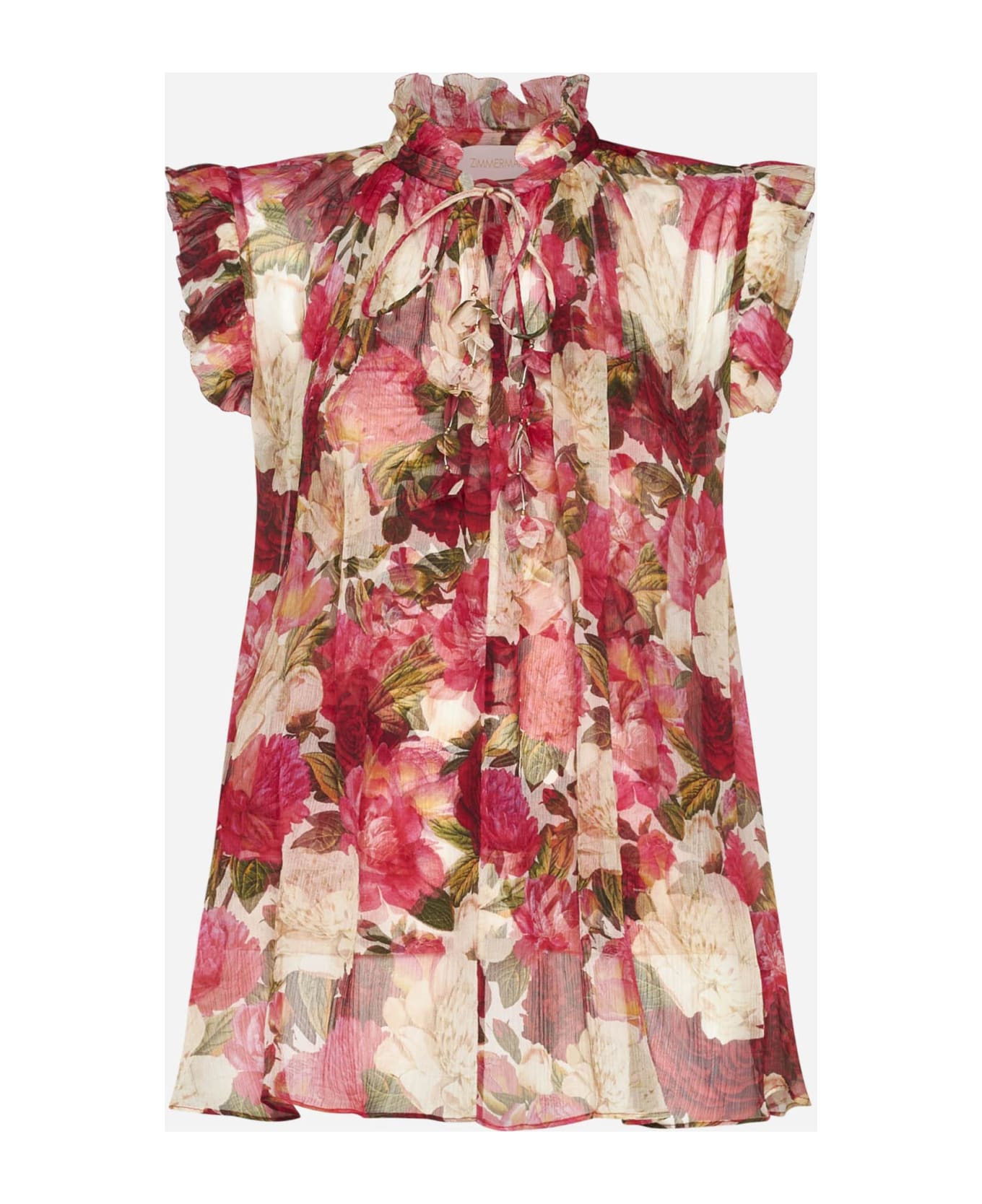 Zimmermann's Wonderland silk georgette blouse featuring a multicolor floral print, frills at neck and cap sleeves, teardrop neckline with self-tie straps and soft pleated style.