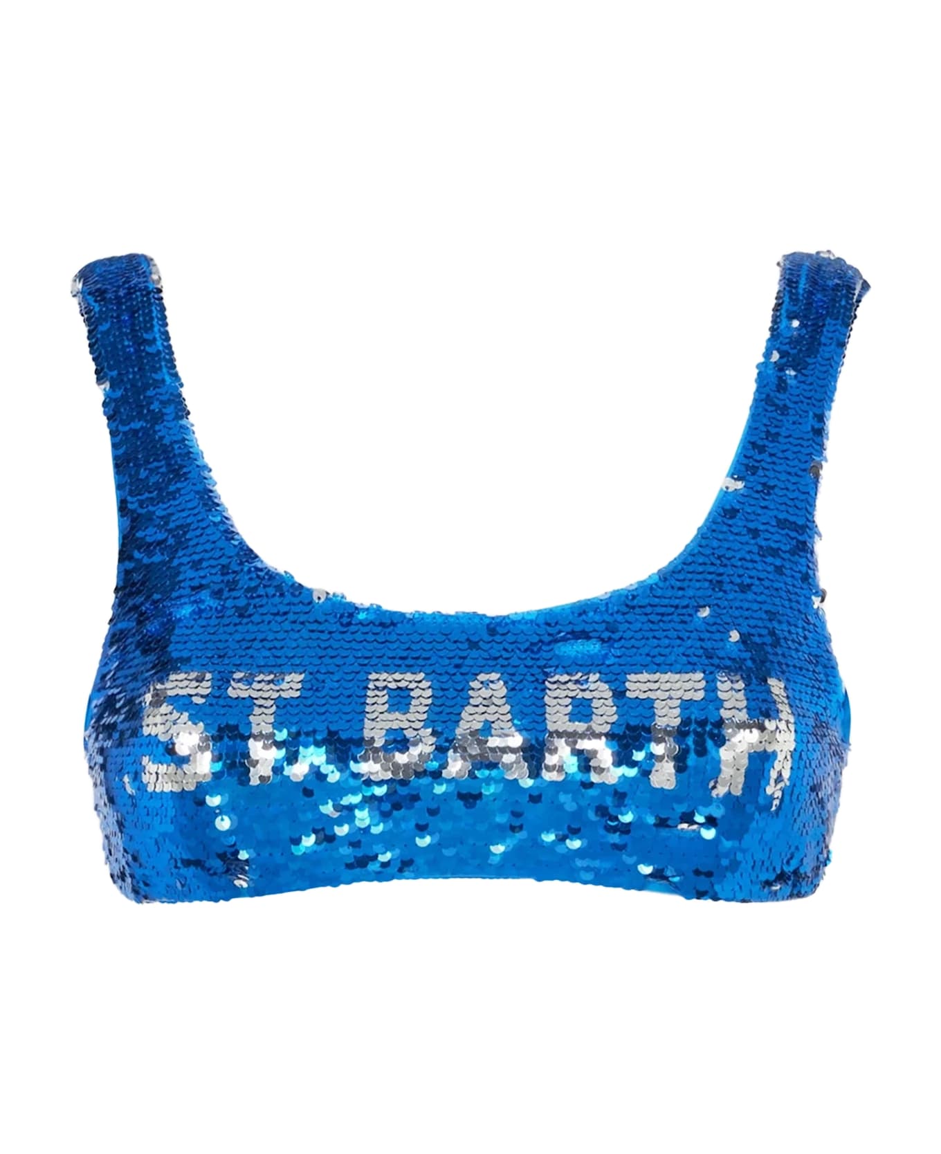Blue sequined bralette with contrasting silver St. Barth logo. The sequins are reversible and, on the other side, the background of the bralette becomes silver and the St. Barth logo is blue. Stretch effect. Regular fit.