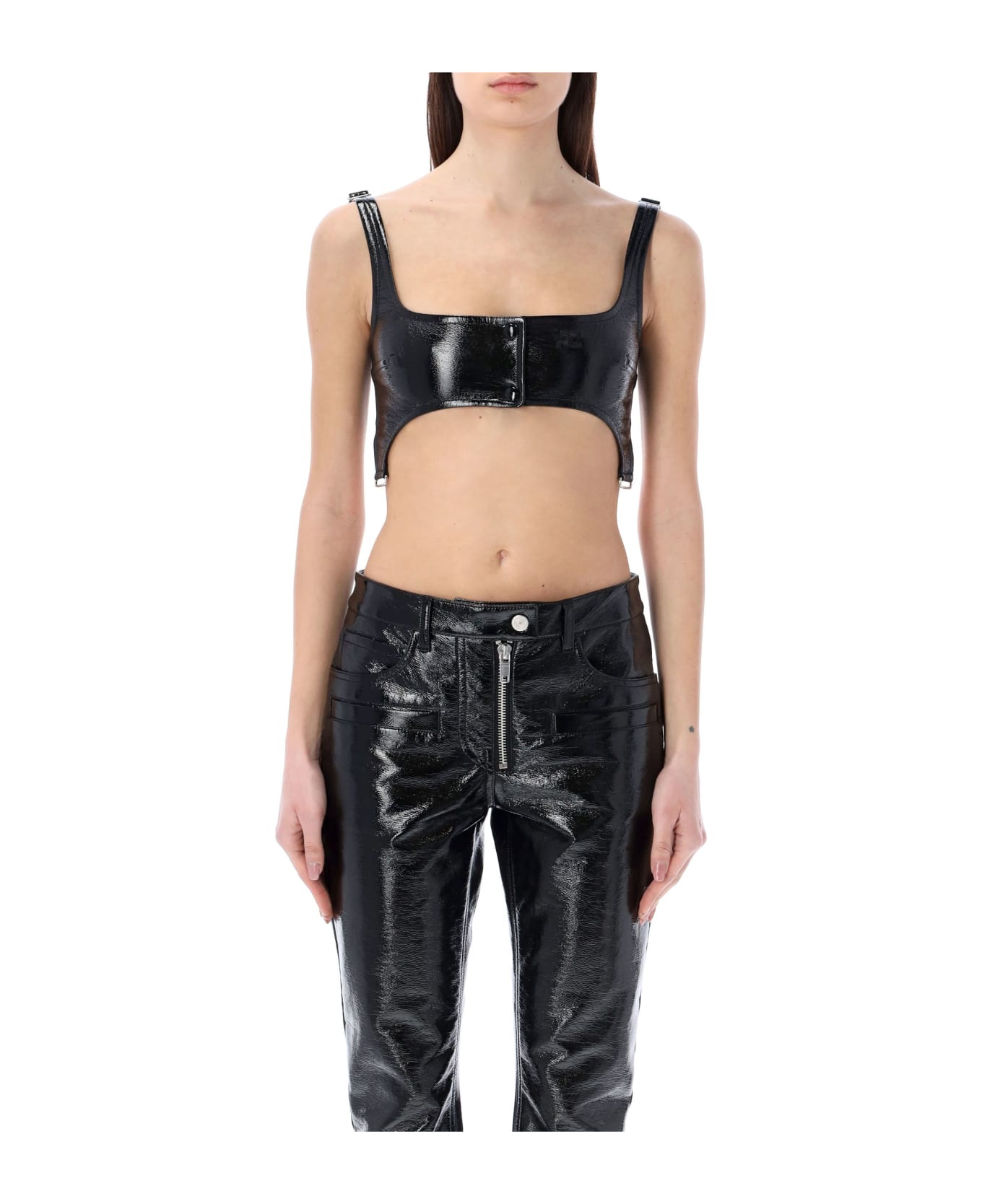 Bretelles Vinyle By Courreges. Featuring: Vinyl Bra With Snaps And Metallic Suspenders Square Neckline Front Button Fastening Logo Embroidery At Front Adjustable Straps Crop Model Is 1,72 M Tall And She Is Wearing Size S
