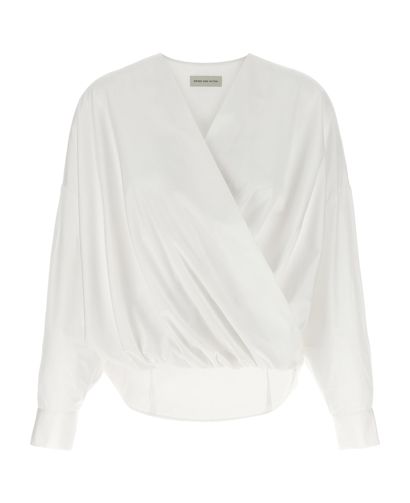 Camiel' wallet top in cotton poplin with front draping, V-neck, long sleeves with shirt cuffs and dropped shoulders.