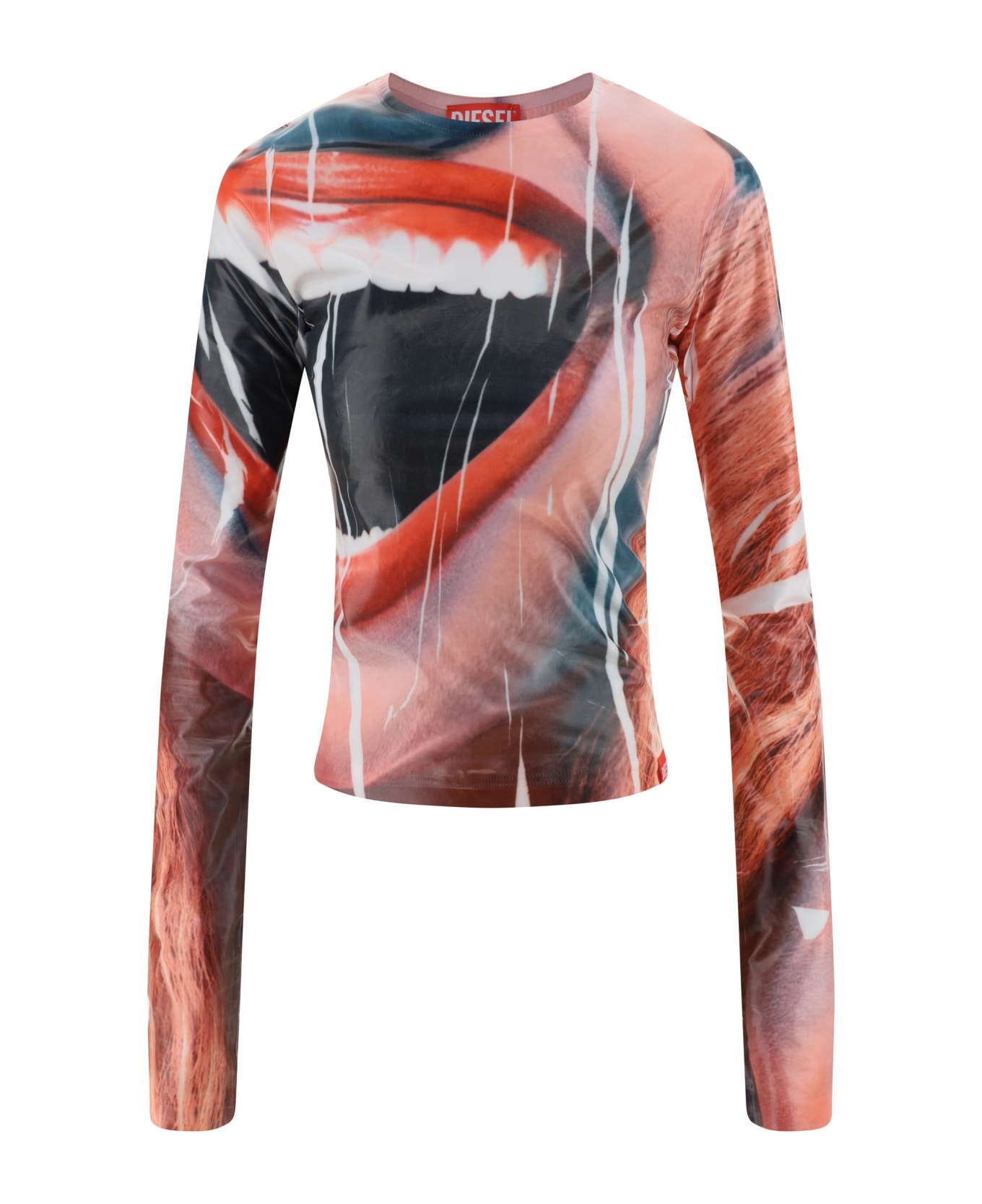 Clauzi top by diesel, long-sleeved crop style, all-over multicolor photographic print, regular fit, contrasting logo fabric patch embroidered on hem. Composition: 16% % Elastane, 84% % Polyester