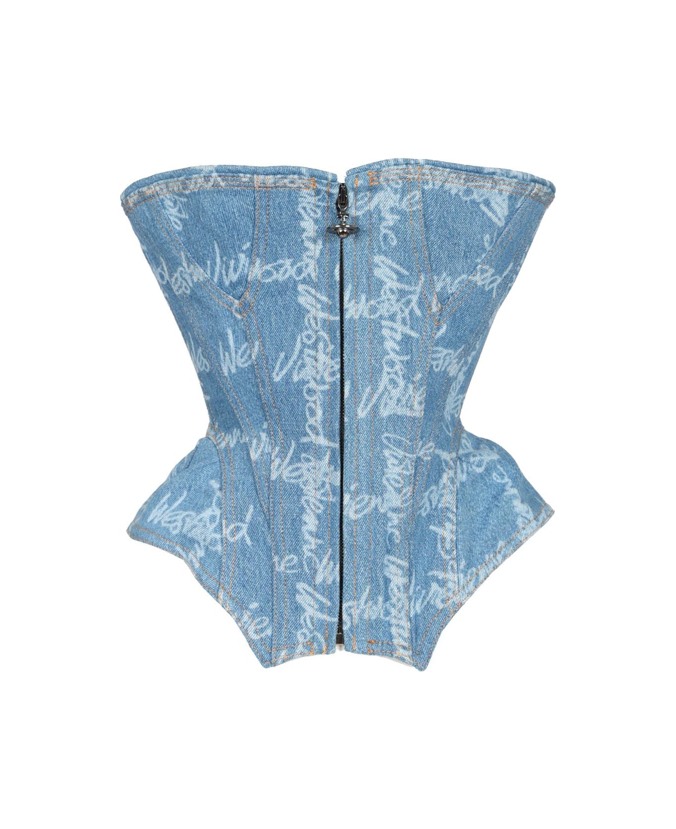 Vivienne Westwood's printed denim "Cobrax" corset features a straight neckline and a front zip fastening, while the back is decorated with contrasting eyelet lacing. Composition: 100% Cotton
