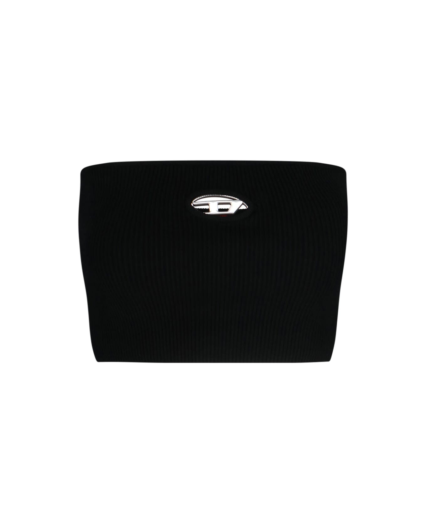 Diesel 'M-Clarksvillex' crop top in black fabric with ribbed pattern, front cut-out detail, silver metal 'Oval D' logo detail, straight hem. Composition: 83% Viscose, 17% Polyester