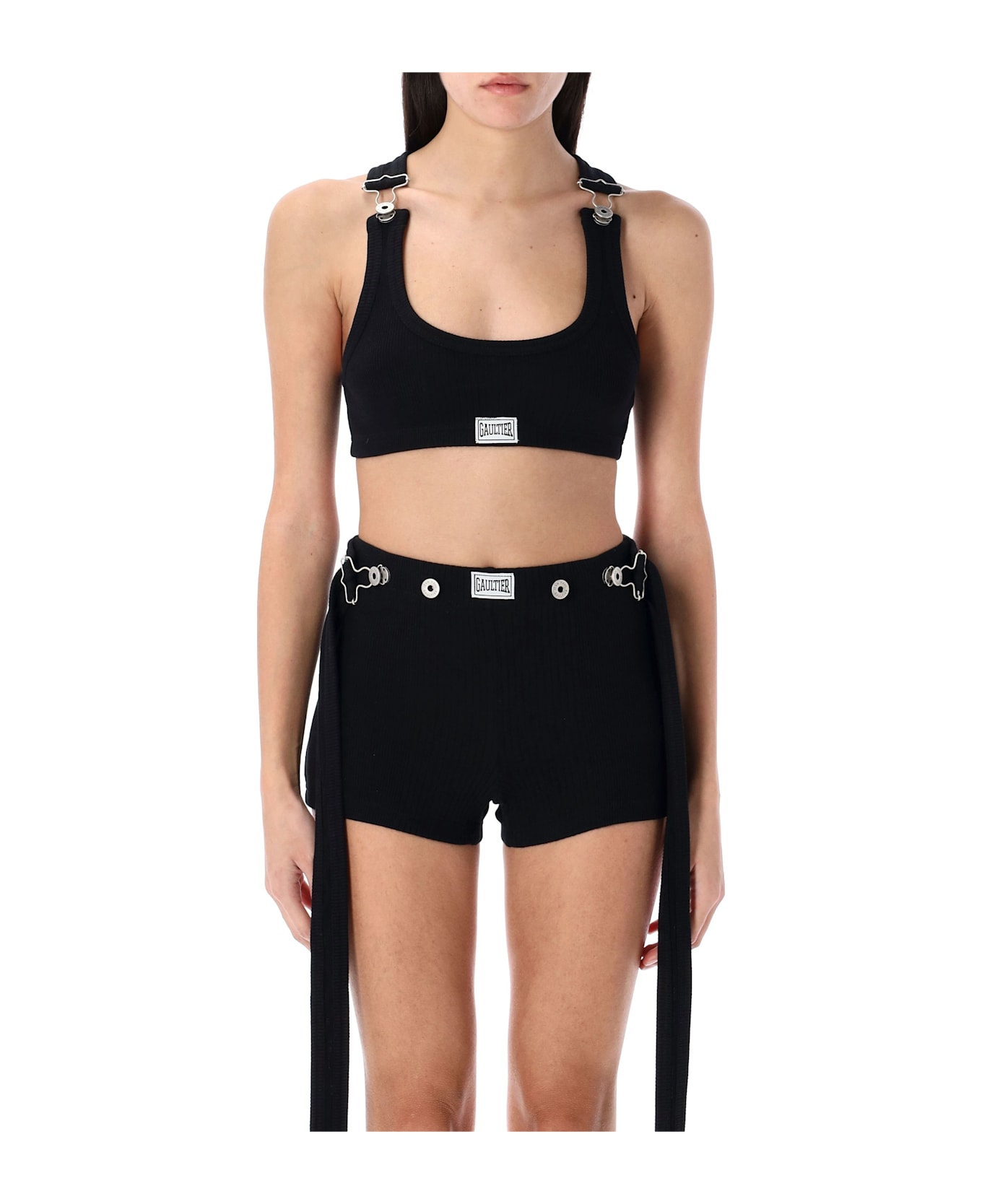 Ribbed Cotton Cropped Patch Tank Top By Jean Paul Gaultier. Featuring: Scoop Neck Metal Overalls-inspired Buckles With Jean Paul Gaultier Engravin Gaultier Patch On Front Cropped Model Il 1,70 M And Wears Size S