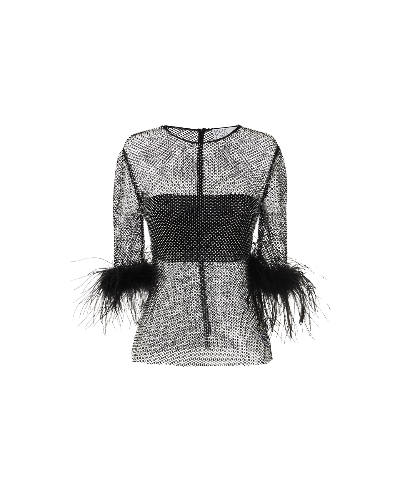 Sheer mesh top with all-over crystal embellishment, crew neck, short sleeves and ostrich feather details. appliqués.
