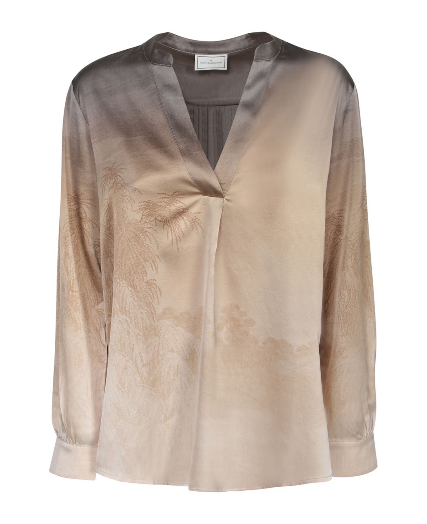 This elegant Pierre-Louis Mascia blouse features a gradient design that fades from beige to gold with a delicate floral pattern. Made from a lightweight and fluid fabric, it offers a relaxed fit that is perfect for both formal and casual occasions.
