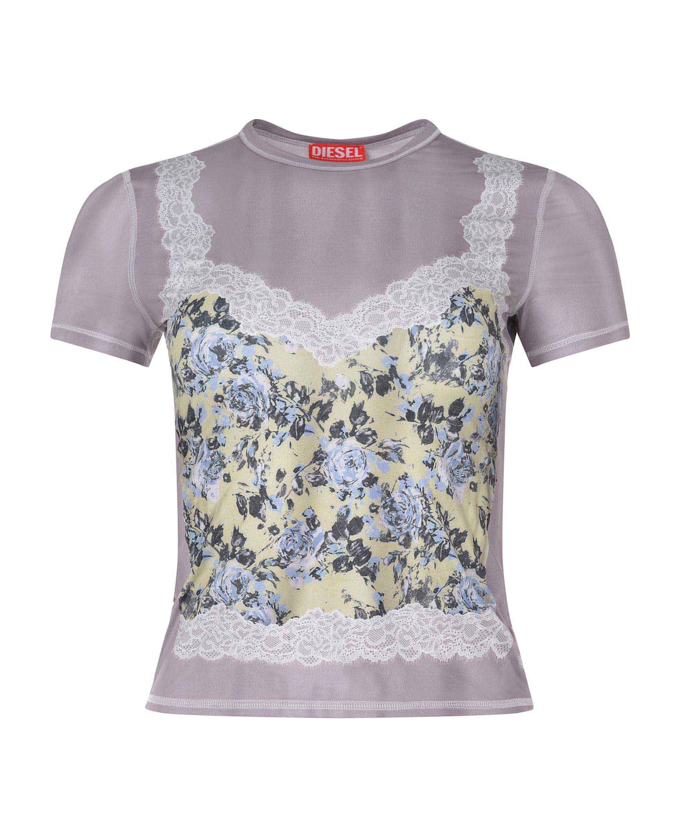 Diesel t-shirt made of light grey polyester. Choker. Short sleeves. Contrasting faux floral top detail on the front and back. 73% polyester 27% elastane Composition: Poliestere