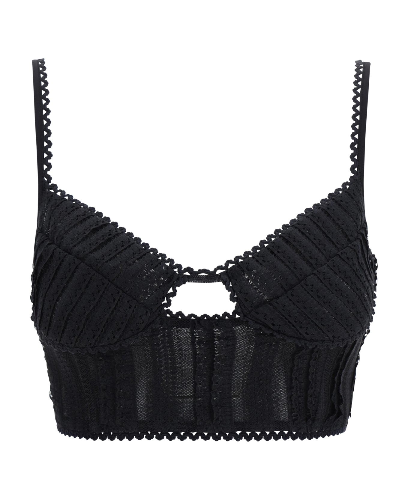 Duomy top by charo ruiz, cropped style, thin straps, concealed zipper closure on side panel, sweetheart neckline with cut-out detail on front, structured cup, ruching stretch fabric on back, monochrome design, all-over perforated lace, fitted fit.