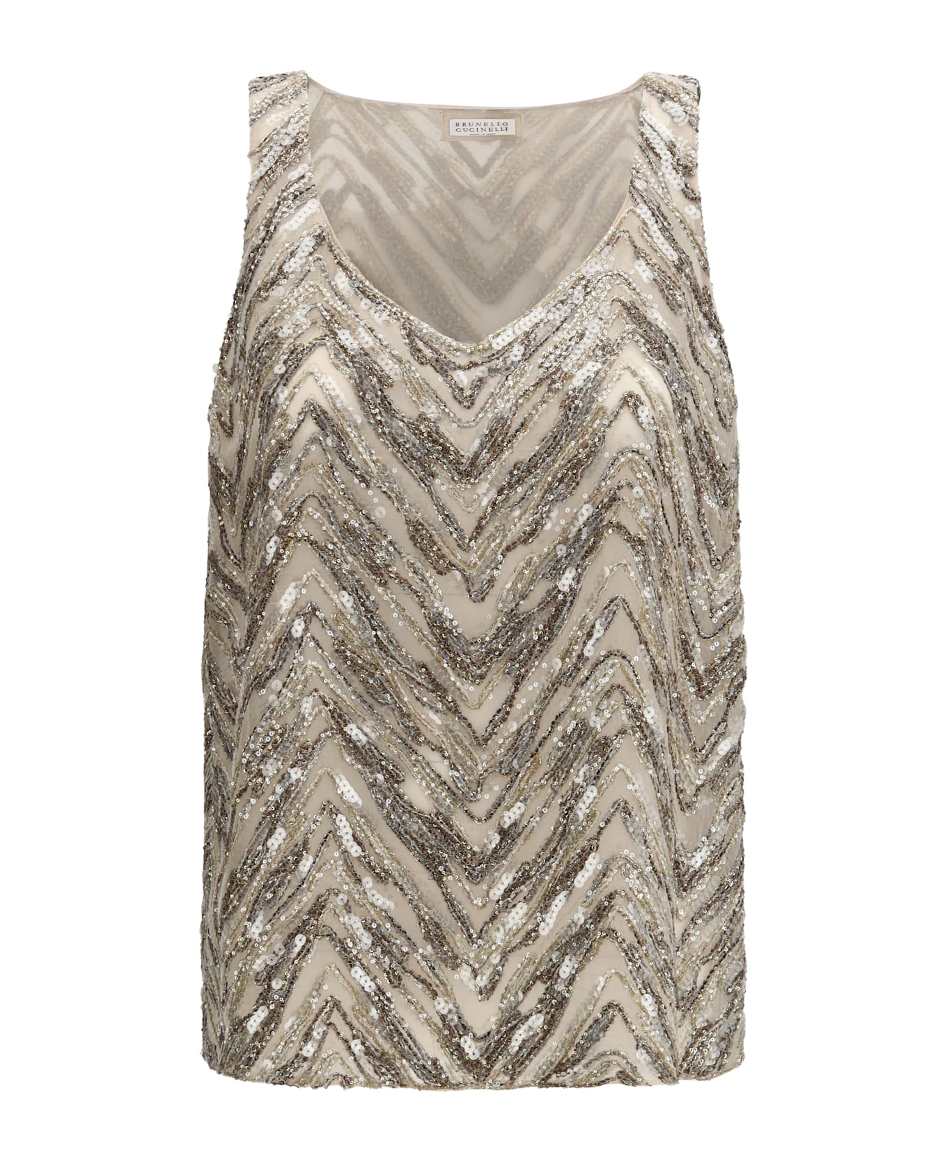 The embroidered top by brunello cucinelli delivers refined, luminous elegance. crafted from crispy silk, it is enhanced by a distinctive dazzling chevron embroidery, a special craftsmanship detail that adds depth and radiance to the design. the v-neckline highlights the silhouette with femininity, while the intricate workmanship reflects the brand s artisanal excellence and sophisticated aesthetic.