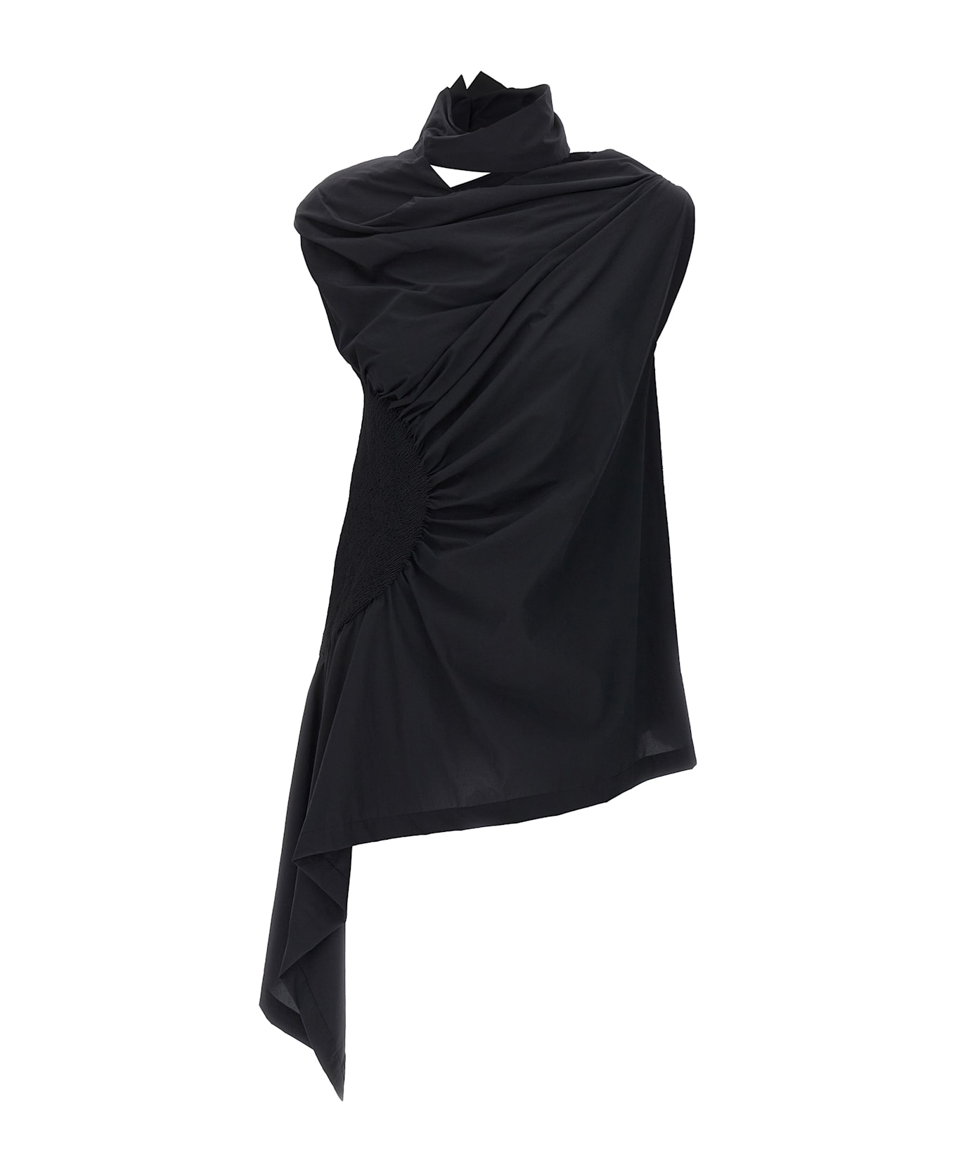 'Eye of the bean' stretch tech fabric asymmetrical top with side ruched detail and draped neckline.