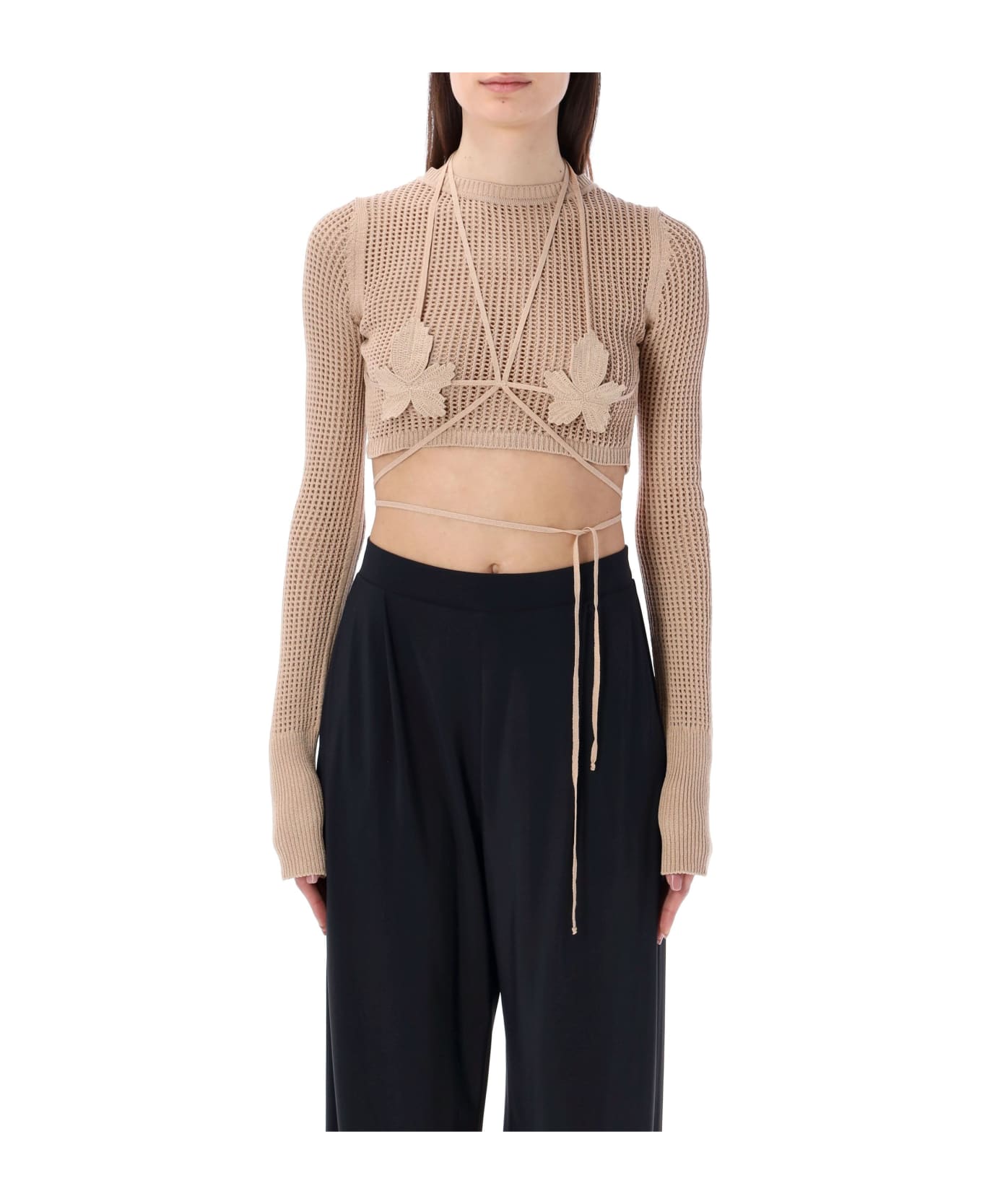 Fishnet Knit Cro Top By Andreadamo. Featuring: Ribbed Round Neck Fishnet Crop Top Long Sleeves Halterneck And Wrap-around Laces With Leaf Embellishment At Breast Model Is 1,72m Tall And She Is Wearing Size S