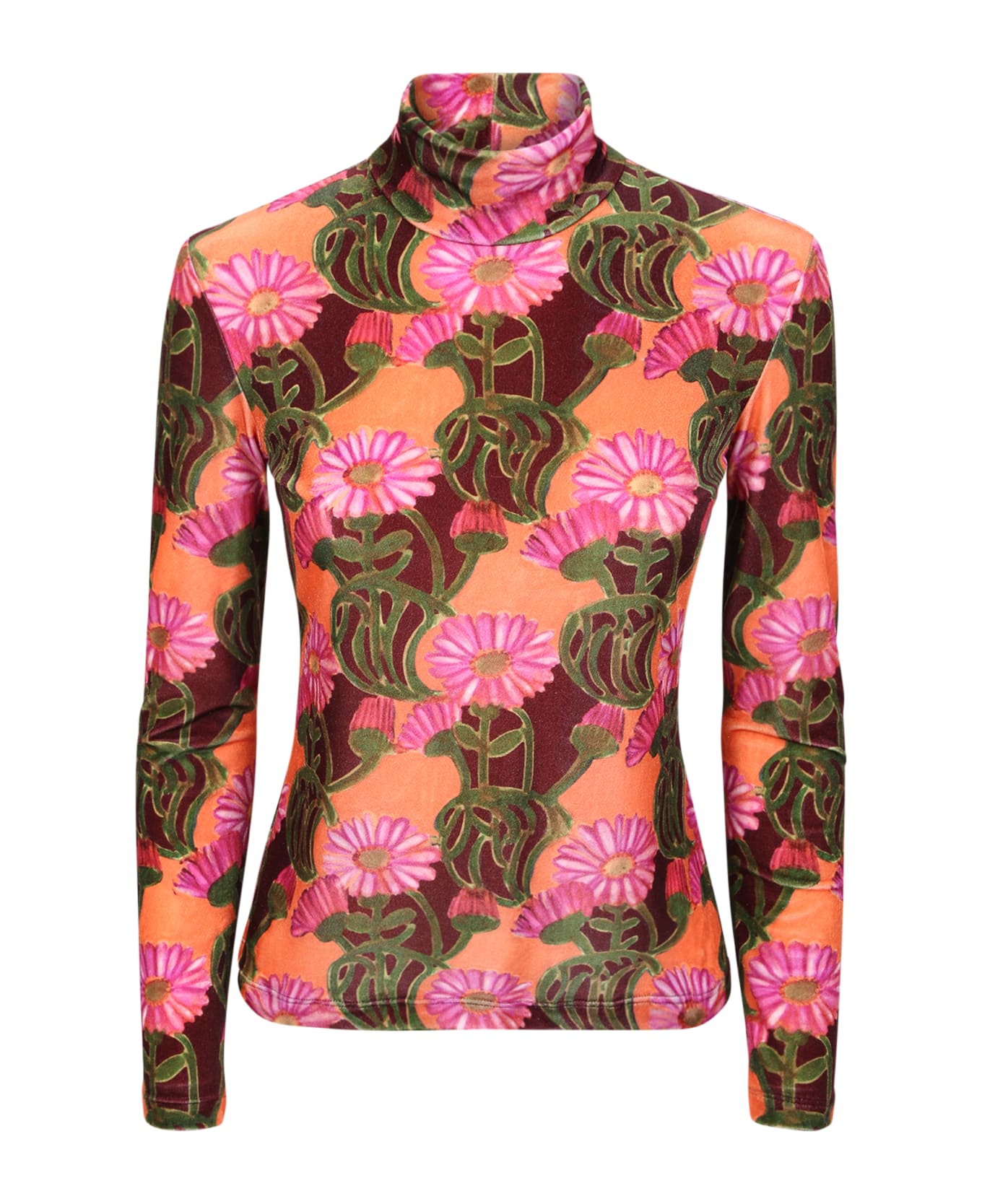 Turtleneck. Long sleeves. All-over floral print. Stretch design. Velvet. Color: orange/ fuxia/ multicolor