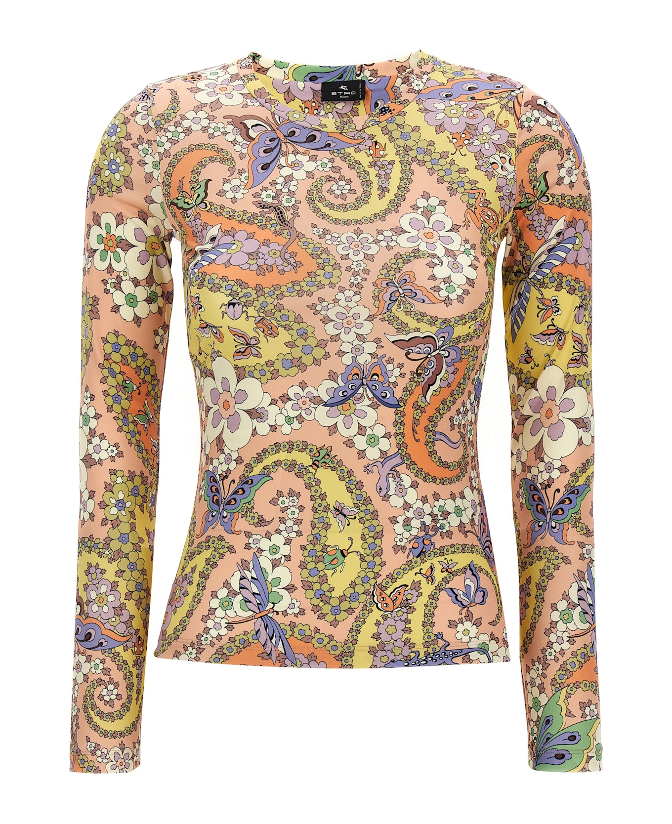 Shiny jersey top with all-over floral print, crew neck, long sleeves.
