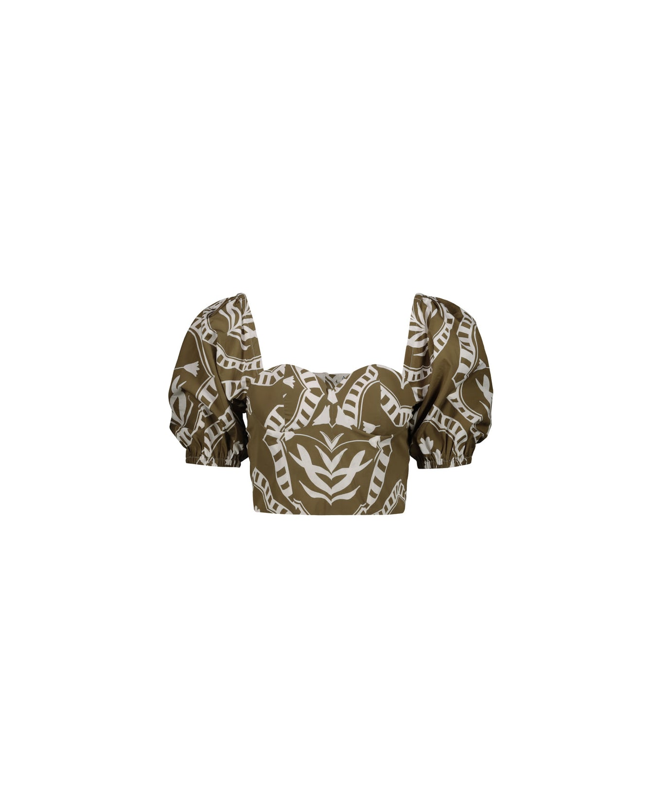 "Francis" bustier top with floreal macro print on neutral shaded cotton. The cropped top is characterised by a heart-shaped neckline, slim-fit bodice and short puff sleeves.