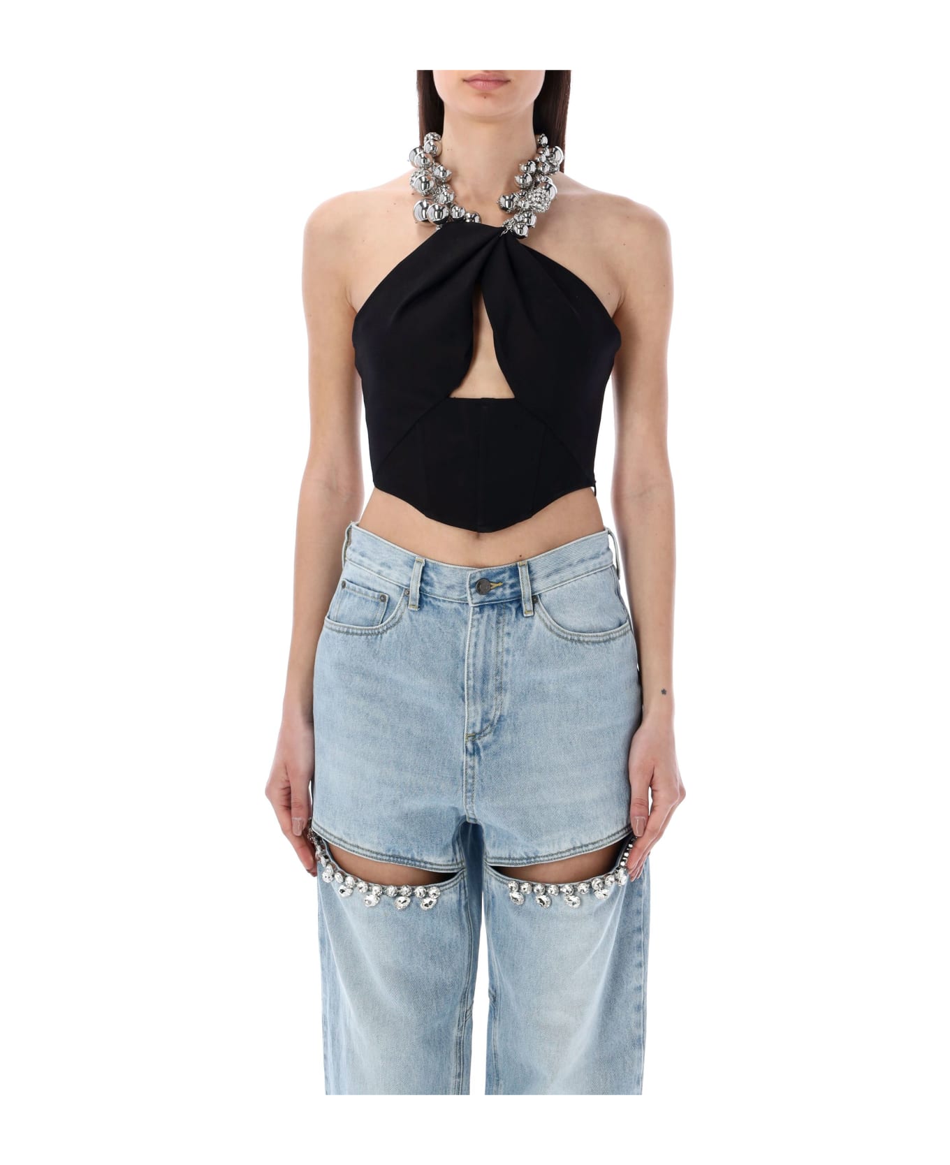 Grape Cluster Halter Top By Area. Featuring: Adjustable Grape Cluster Halterneck Strass Embellishment Strapless Padded Draped Front Cut-out Detail At Chest Side Zip Fastening Corset Design Open Back Crop Fit Model Is 1,72 M Tall And She Is Wearing Size S