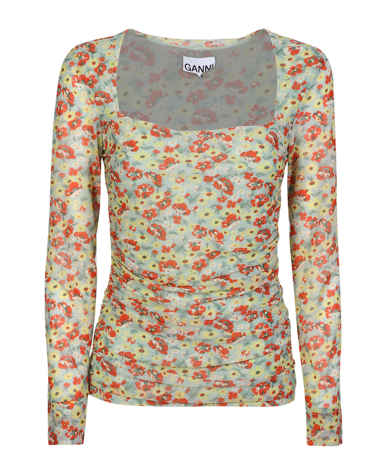 This chic Ganni semi-sheer mesh blouse features a lively floral pattern and unique ruched neckline, perfect for a fresh and feminine look. Composition: 100% Nylon