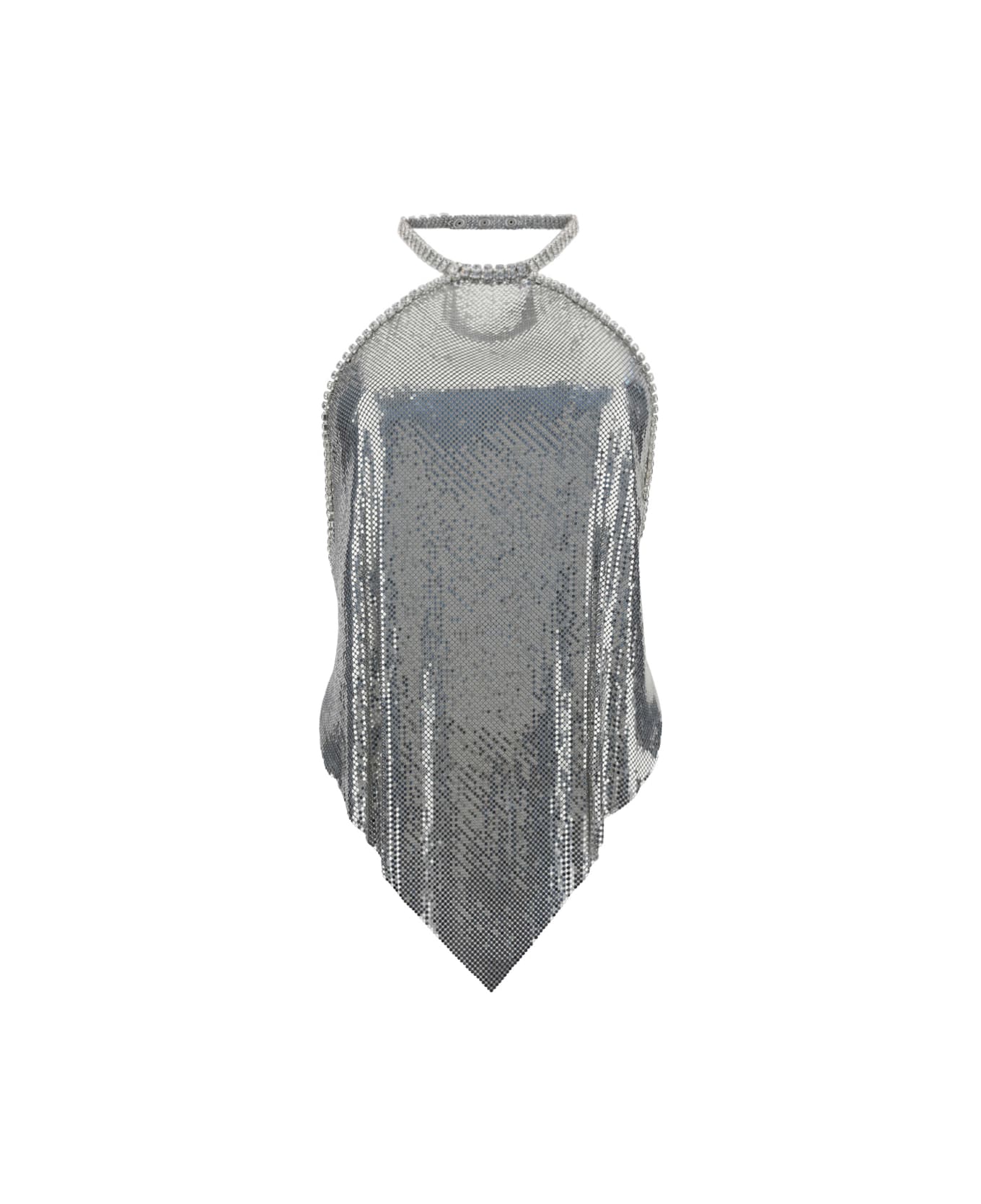Aluminium halter top by paco rabanne, halter neckline on the front, appliqué glitter embellishment on the neckline, iconic mirrored mesh weave, pointed hem, snap button fastening on the back.