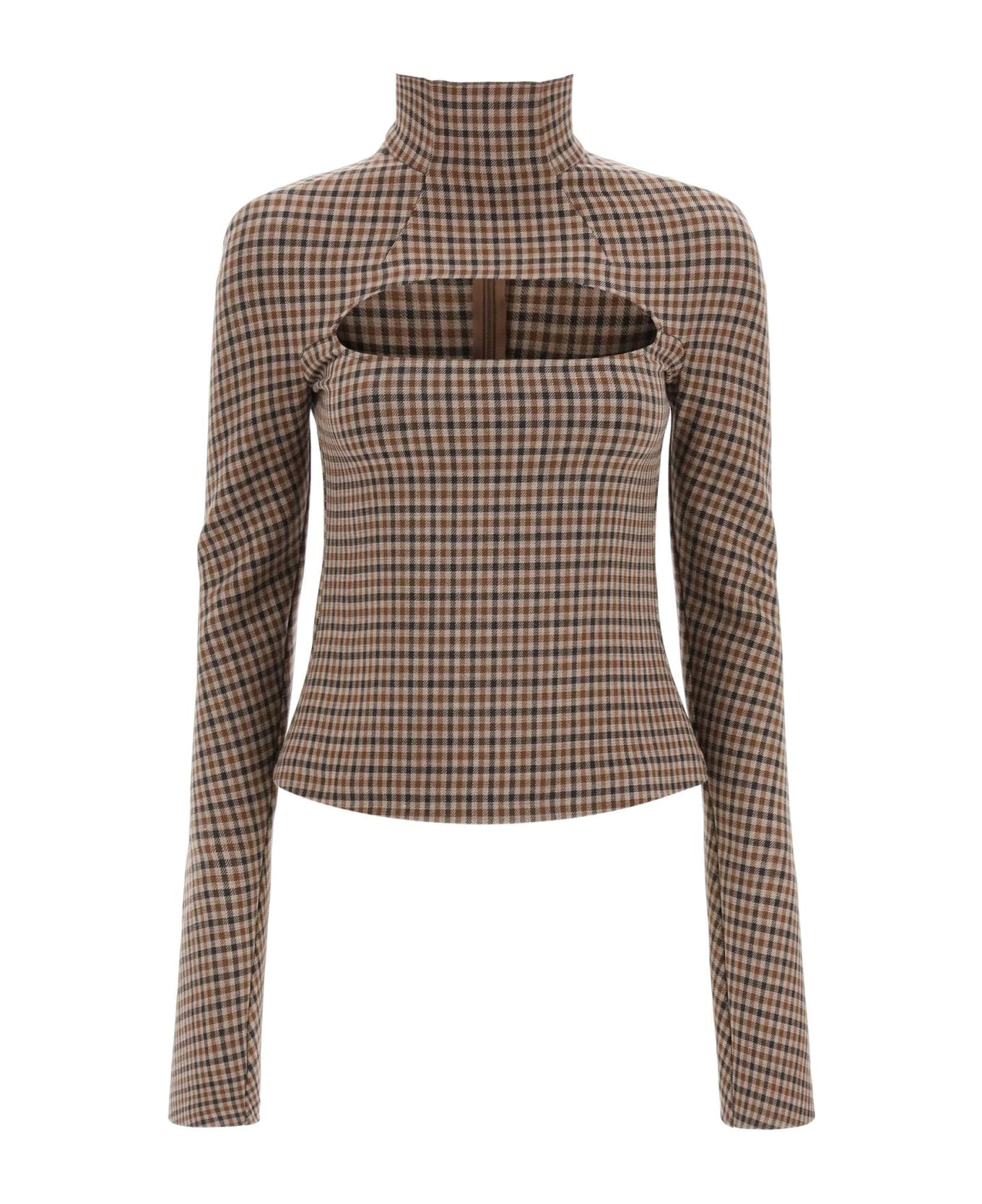 High-neck top from A. w. a. k. e. Mode in stretch virgin wool-blend twill, featuring long flared sleeves and an oval cut-out at the chest. Slim fit, finished with invisible back zipper closure. The model is 177 cm tall and wears a size FR 36.