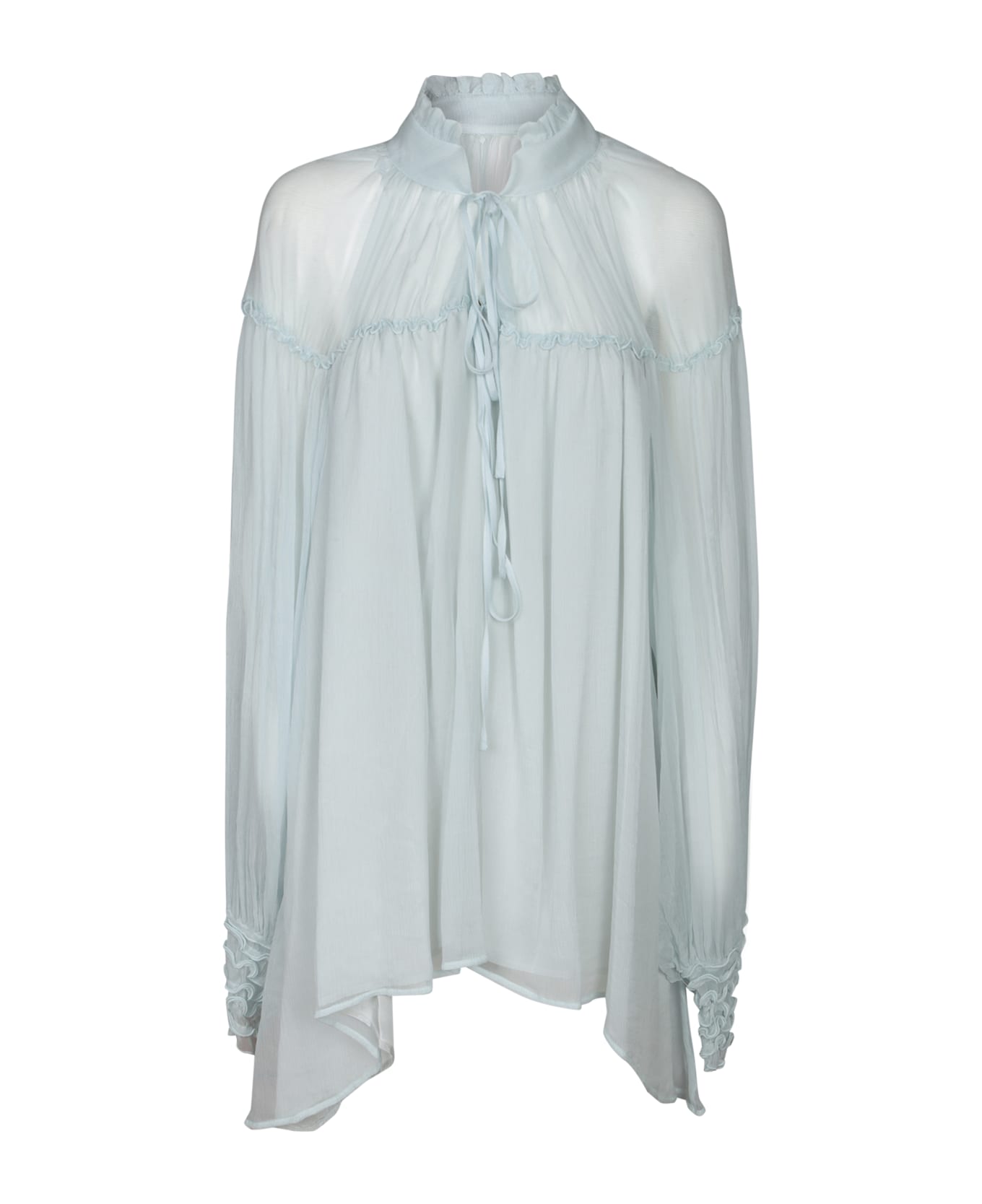 This elegant AMEN celeste silk chiffon blouse boasts a sophisticated and feminine silhouette. Its flowing design and the delicate gathered detail at the neck add a touch of grace. Composition: 100% Silk