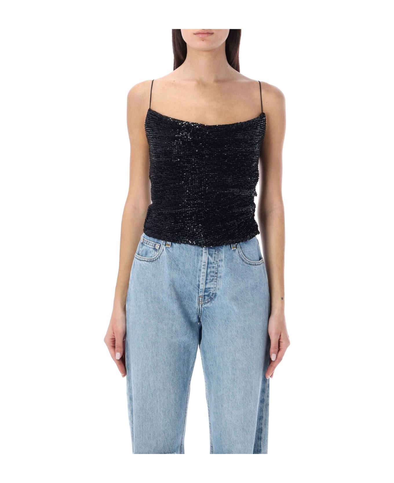Lilburn Sequin Top By Gauge81. Featuring: Thin Straps Scoop Neckline At Front And Back Convered In Sequins Cropped Side Drape Lined Model Is 1,72m Tall And She Is Wearing Size S
