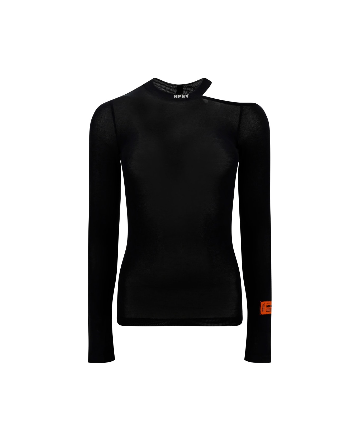 Long sleeve jersey by heron preston, semi-sheer design, ribbed crew neck, iconic brand monogram embroidered on crew neck, cut-out detail on left shoulder, slim fit. Composition: 1% % Elastane, 99% % Viscose