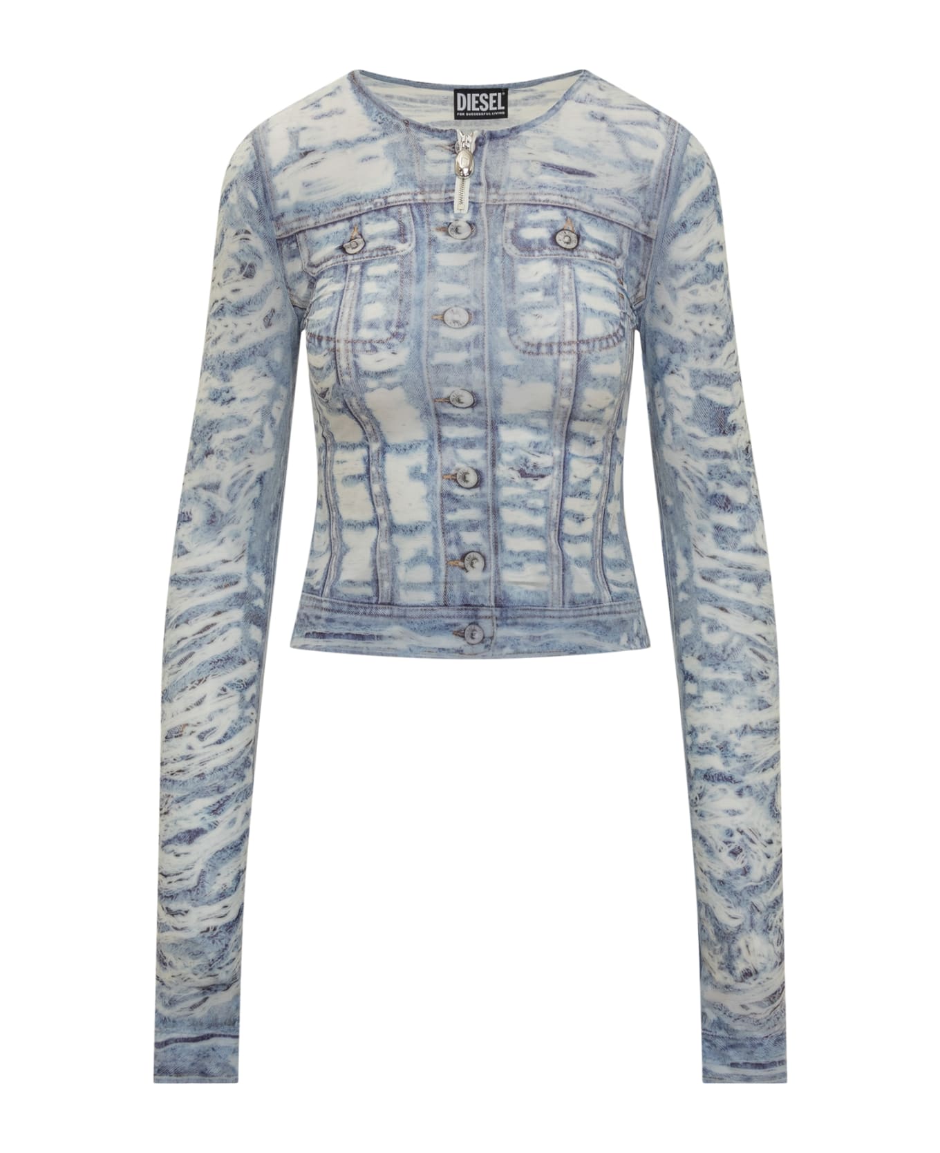 Long sleeved top. Round neckline. Zip on the chest. All over denim print. Composition: 73% Polyamide, 27% Elastane