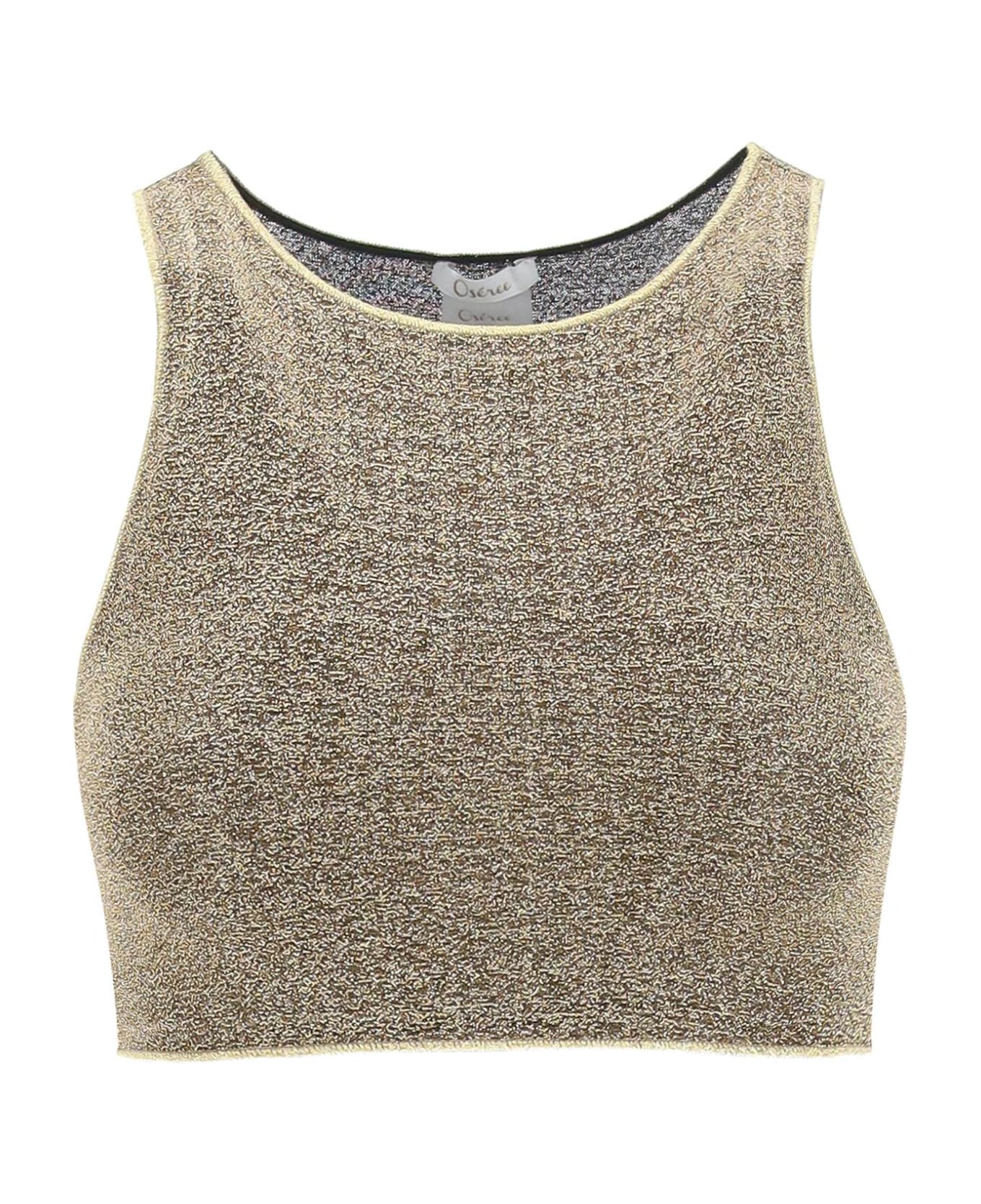 Lumière cropped tank top by Oséree crafted in stretch lurex fabric. Slim fit, crew neck, micro mesh lining. The model is 177 cm tall and wears a size S.