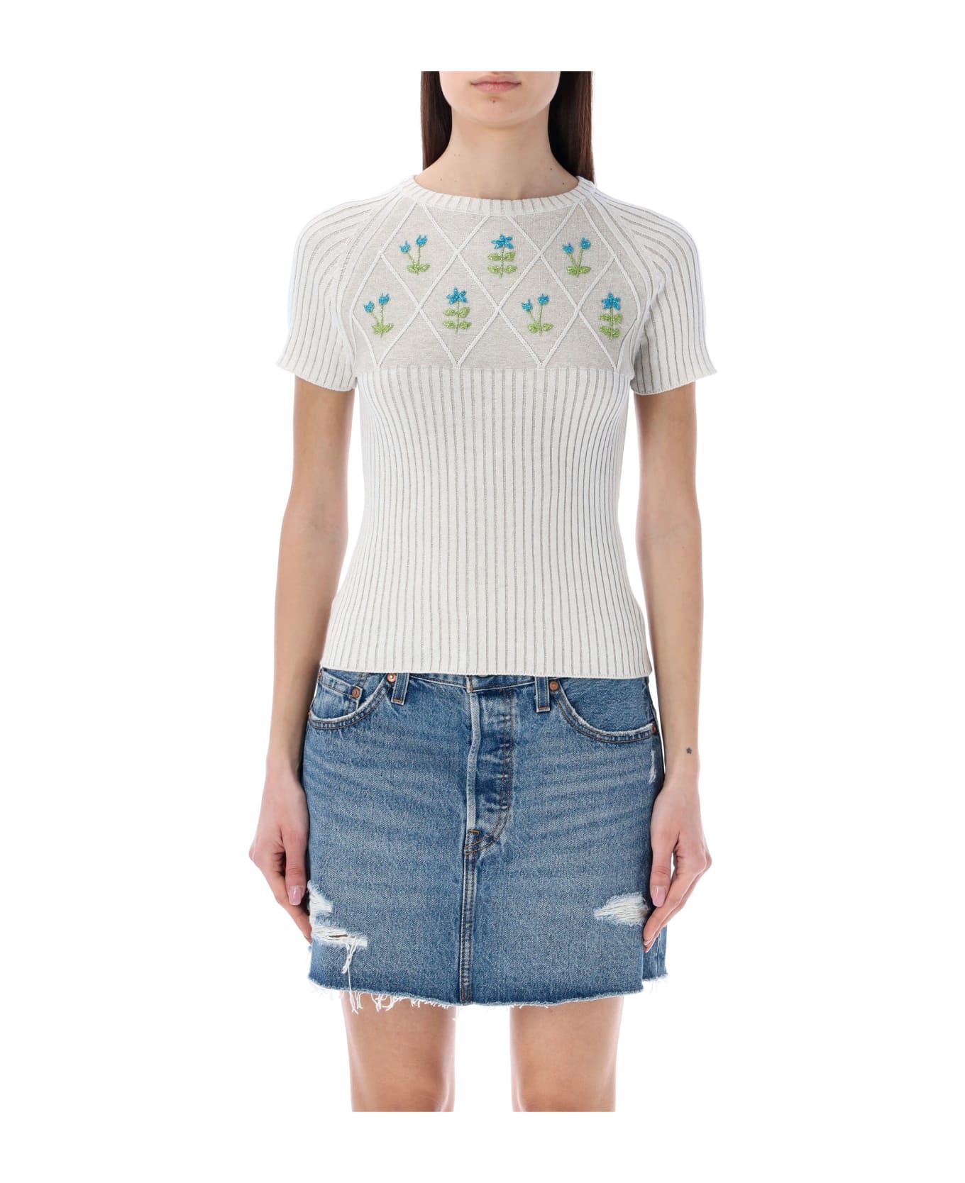 Cotton Lurex Short Sleeve Sweater With Embroidery By Cormio. Featuring: Ribbed Crewneck Short Sleeves Rib Knit Geometric Stitching With Flower Embroideries Lurex Threads Throughout Fitted Model Is 1,72 M Tall And She Is Wearing Size 40